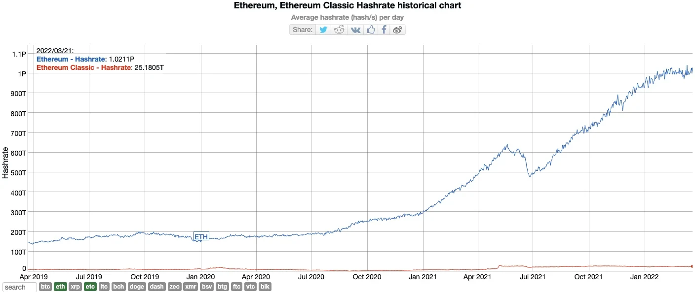 例如,随着以太坊合并在不久的将来到来,使以太坊PoW挖矿迈向终结, ETC官方部落格也在3月18日发布了矿工算力迁移指南,表示欢迎被剥夺权利的以太坊矿工。ETC官方建议,在以太坊合并启动之前,以太坊矿工就可将设备迁移至ETChash ,以改挖ETC。