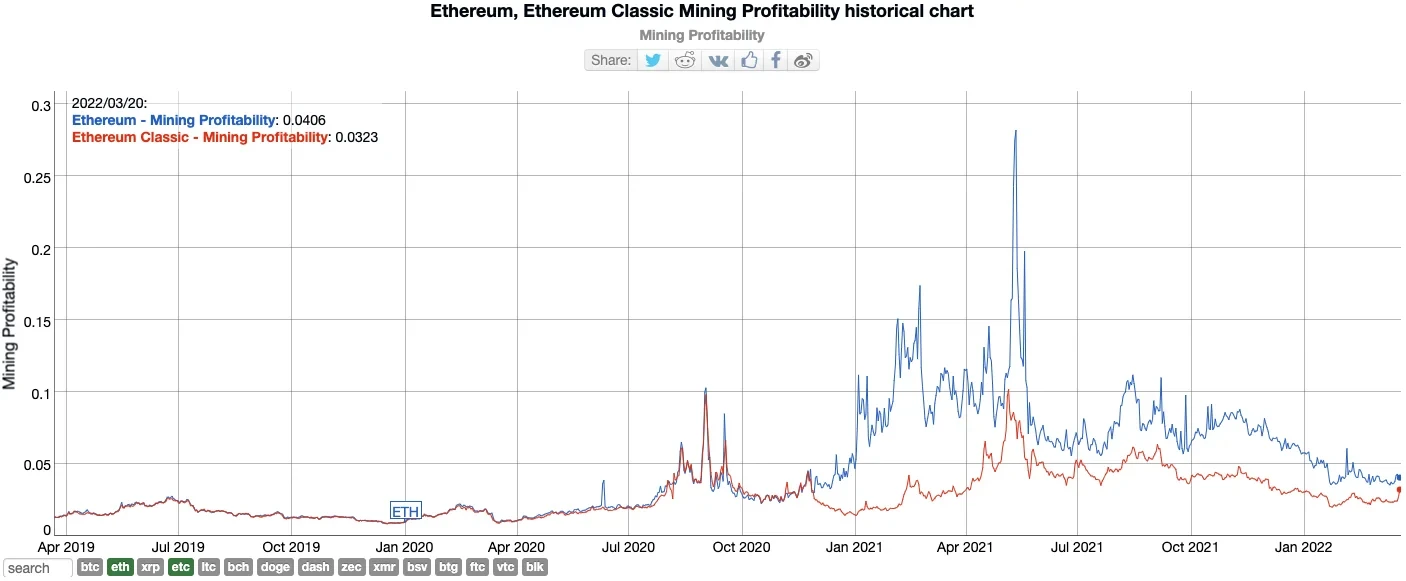 根据bitinfocharts数据,ETH当下算力为1.02P,ETC算力为25T,前者总算力是后者的40倍左右。而ETH代币价格为ETC的69倍。换而言之,如果ETH网络矿工将所有算力切换至ETC网络,在保证收益不变的情况下,ETC网络算力将上涨40倍,而代币价格需要上涨69倍。