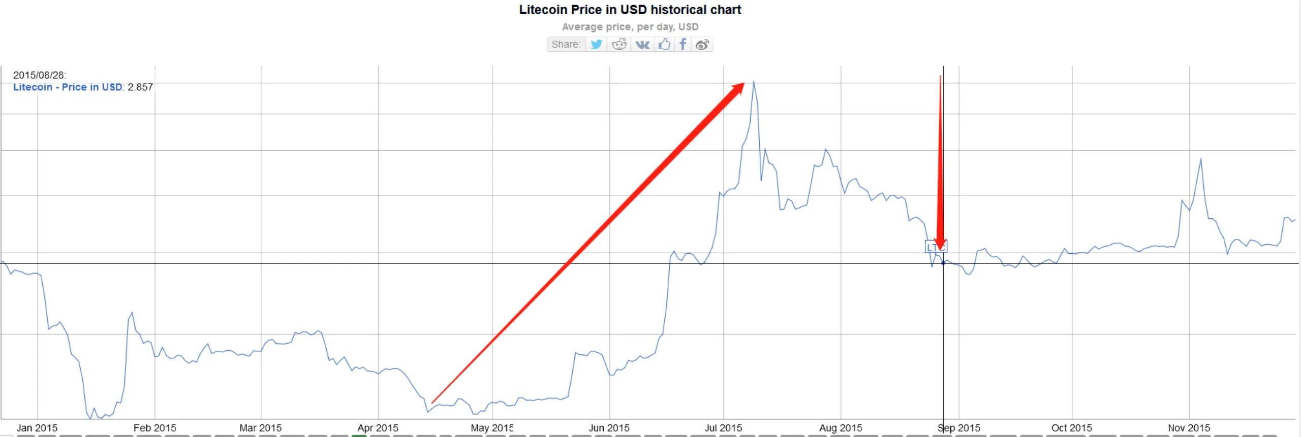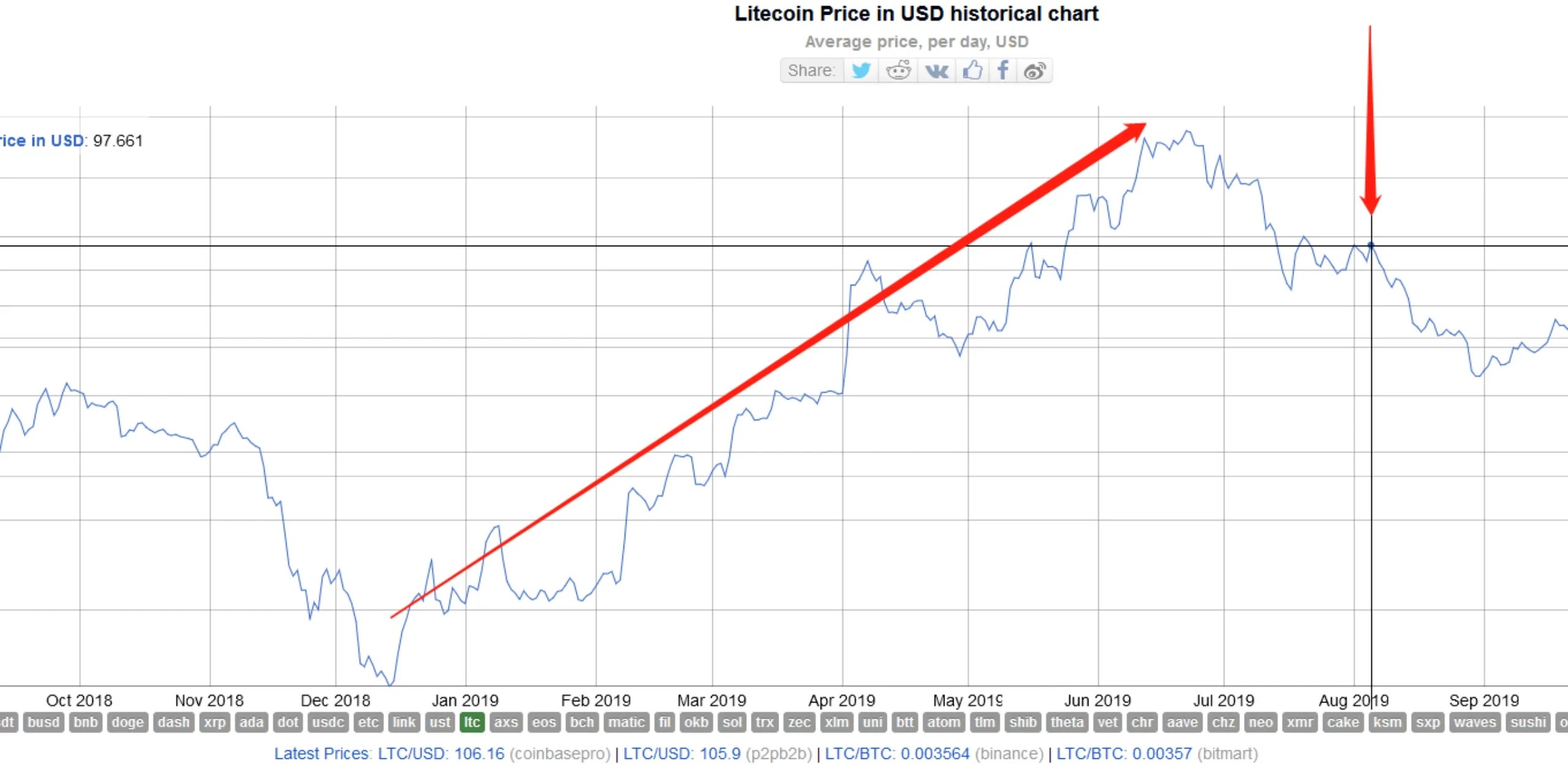 2015年8月28日,LTC经历了诞生以来的第一次减半,区块奖励从50个LTC下降到25个,LTC价格从1.4USD上涨至USD,涨幅400%。2019年8月5日,莱特币经历了诞生以来的第二次减半,区块奖励从25个下降到12.5,LTC价格从23USD上涨到140USD,涨幅500%。