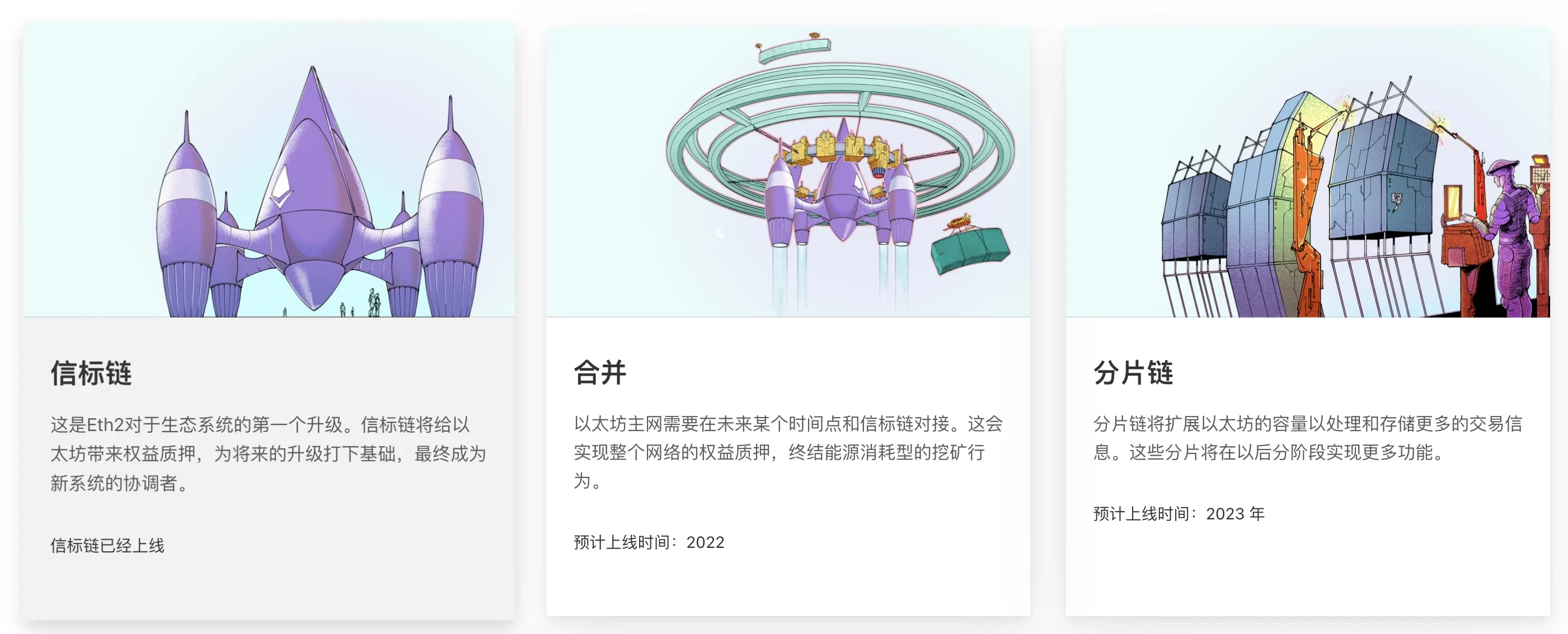 根据以太坊官网,ETH 2.0升级主要分为三个步骤,即:a)信标链上线;b)合并,信标链与Eth1合并,并通过难度炸弹淘汰PoW;c)分片链上线。