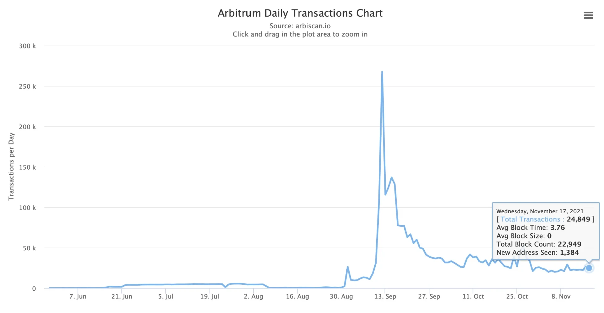 从使用情况和生态表现来看,Arbitrum似乎更受社区的欢迎,增长势头也远超Optimism。据L2BEAT数据显示,Arbitrum网络中已经锁定了价值超26亿美元的数字资产,占整个Layer2生态锁仓量的48.42%,在L2网络中锁仓量排名第一。而Optimism网络目前的锁仓量为4.53亿美元,占总锁仓量份额的8.45%,在L2网络中锁仓量排名第四。 Arbitrum官方浏览器数据显示,截至11月17日,Arbitrum网络唯一地址数已突破 26.6万个,较上线之初(6409 个)增长超40倍。当日交易笔数24,849笔,较上线之初出现回落,近期变化幅度较小。