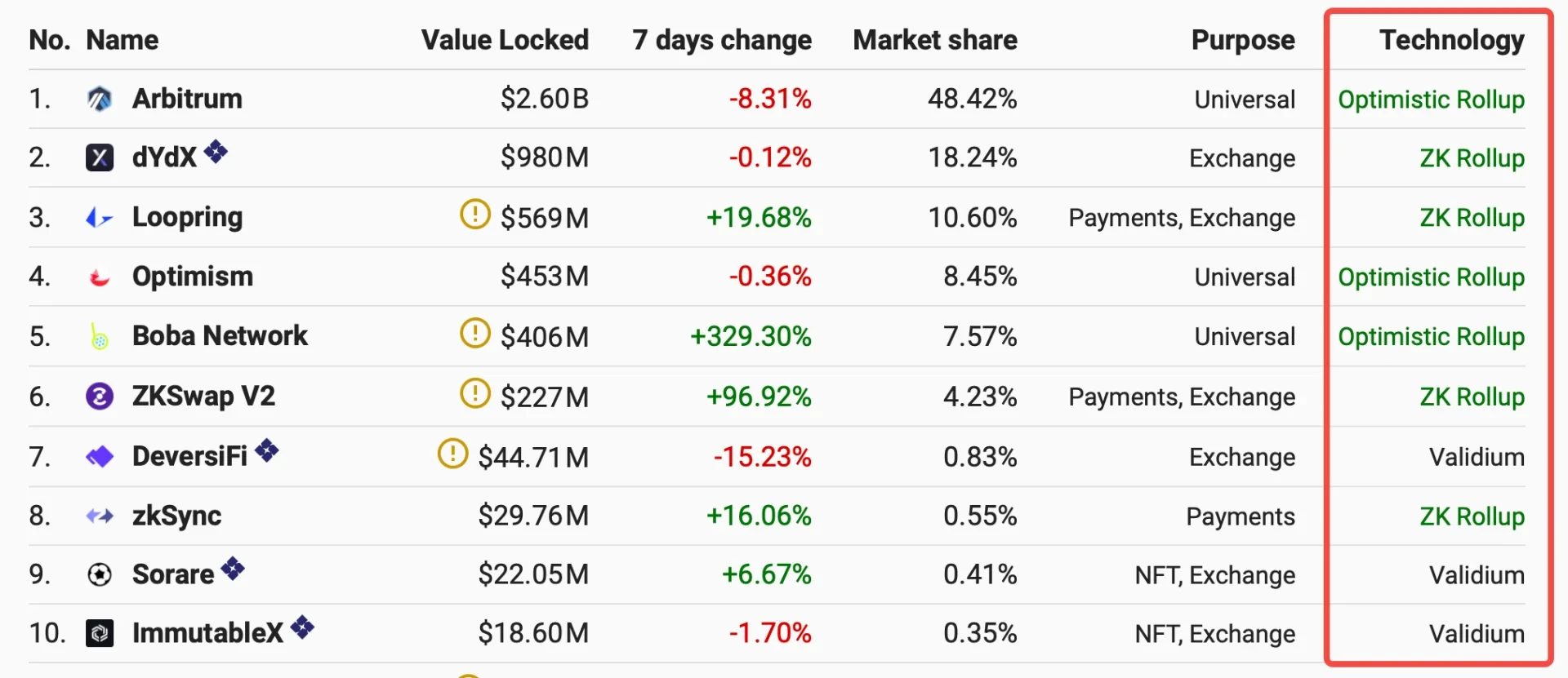 总体来看,Arbitrum后来居上,在生态项目和体量增长上发展迅速,Optimism相对增长较缓,目前主要依赖于Synthetix和Uniswap V3的生态贡献。当然,除了Arbitrum和Optimism,其它Layer2扩容方案的项目比如ZkSync、Loopring(LRC)、Immutable X(IMX)、Aztec、StarkWare、ZKSwap等同样取得了一些比较重要的进展。