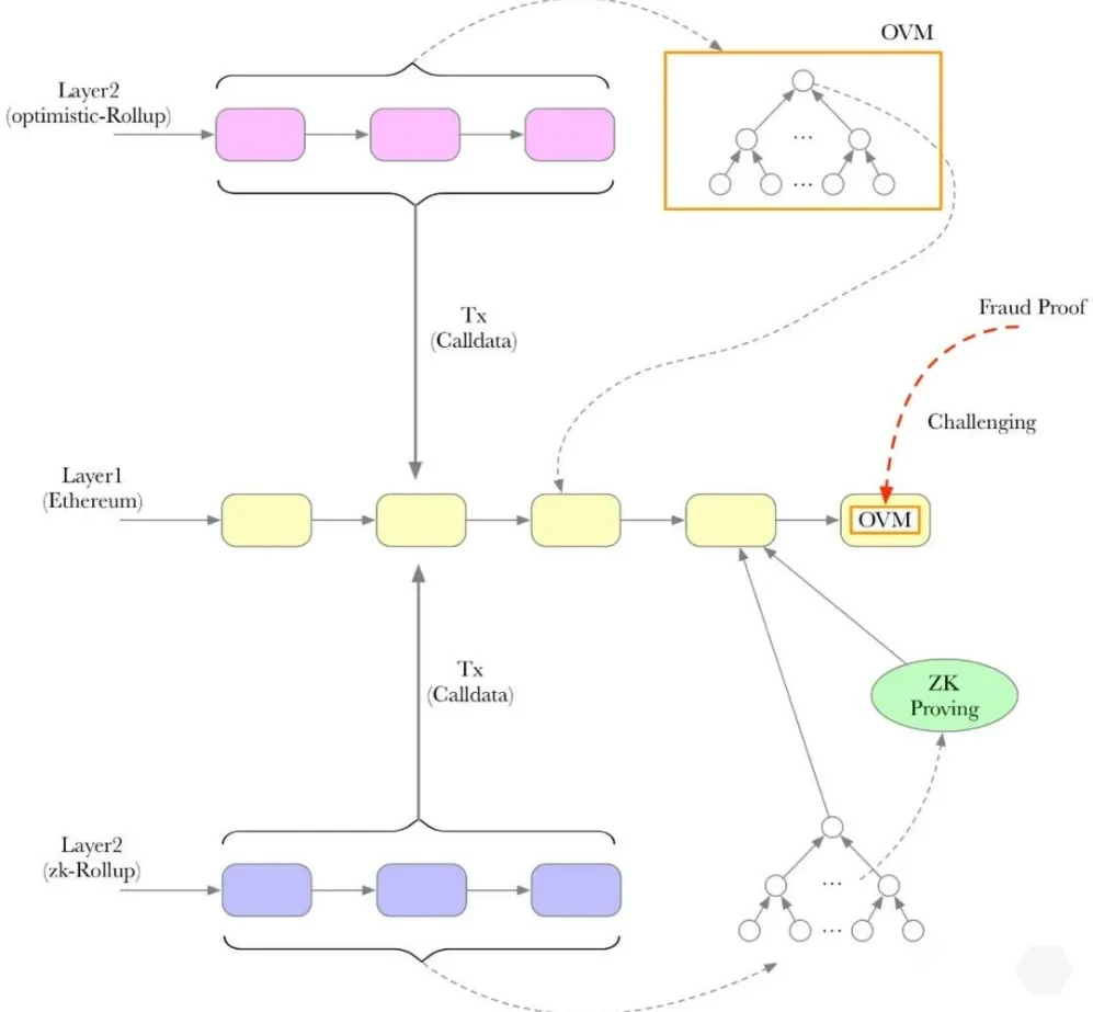 Optimistic Rollup 利用 OVM(Optimistic 虚拟机,类似EVM) 在 Layer2 中运行智能合约,并由 L1 链保护。它依赖于部署智能合约的聚合器,在“rollup 区块”中积累大量交易,并将其捆绑发布到 L1 链上。Optimistic的意思是“乐观”,它默认把所有的参与者视为好人,倾向于相信节点不会作恶,因此Optimistic Rollup技术的信任成本较高。