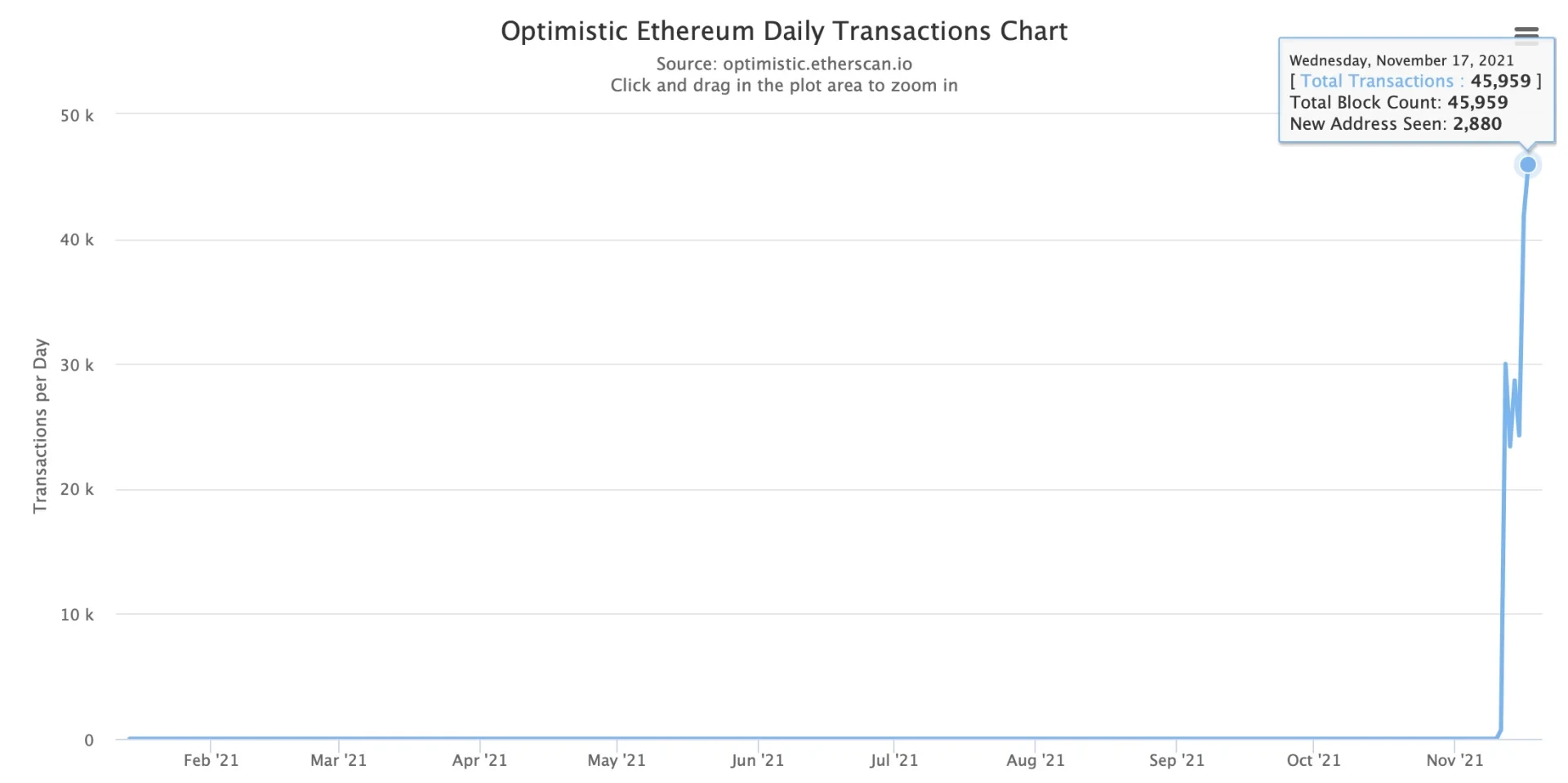 而Optimism网络当前(11月17日)唯一地址数突破2.58万个,仅在近一周出现了快速增长趋势。当日交易笔数为45,959笔,近一周增长73倍。