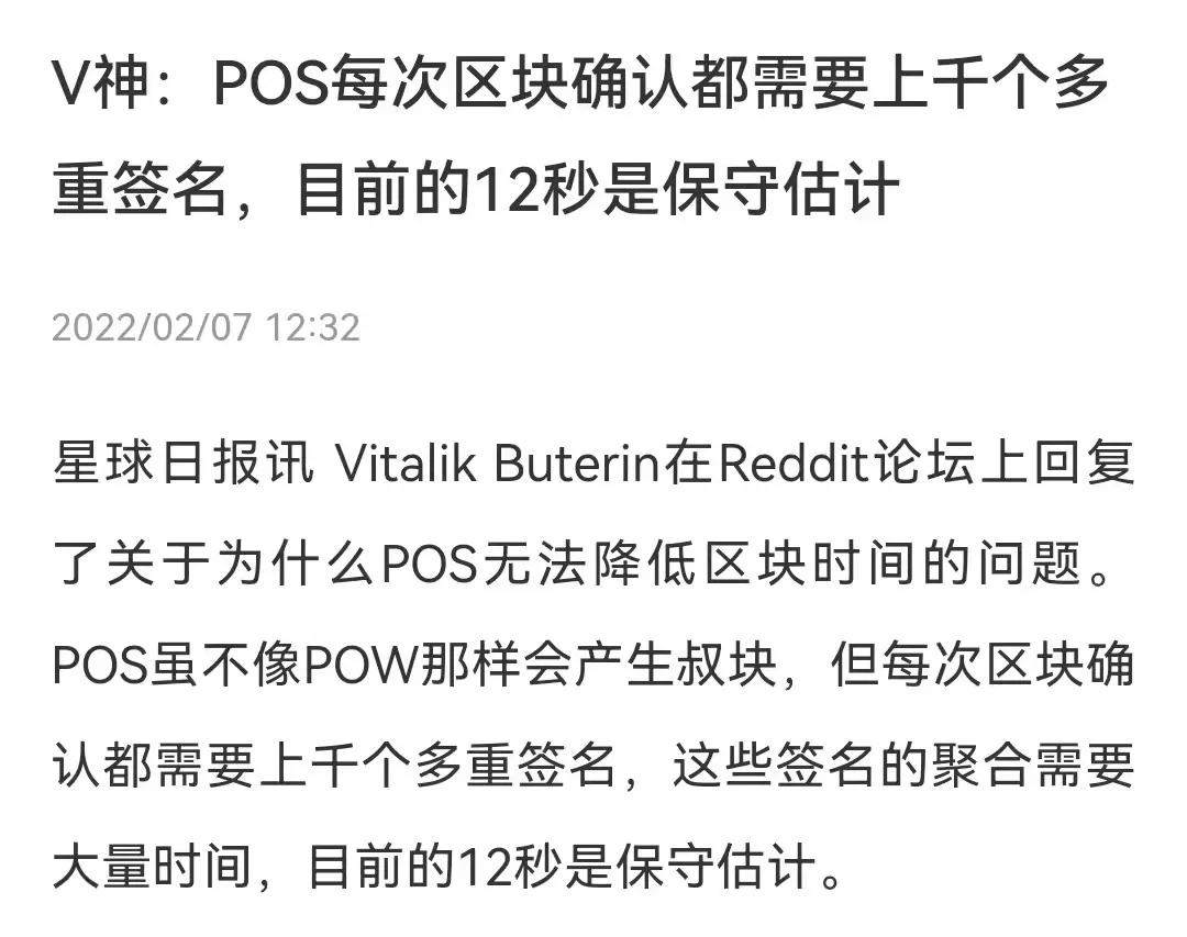 近期,以太坊创始人Vitalik在与社区交流过程中表示,虽然PoS状态下的区块链并不会产生叔块(Uncle Block),但PoS状态下,每次区块确认都需要上千个多重签名,12s还是保守估计。