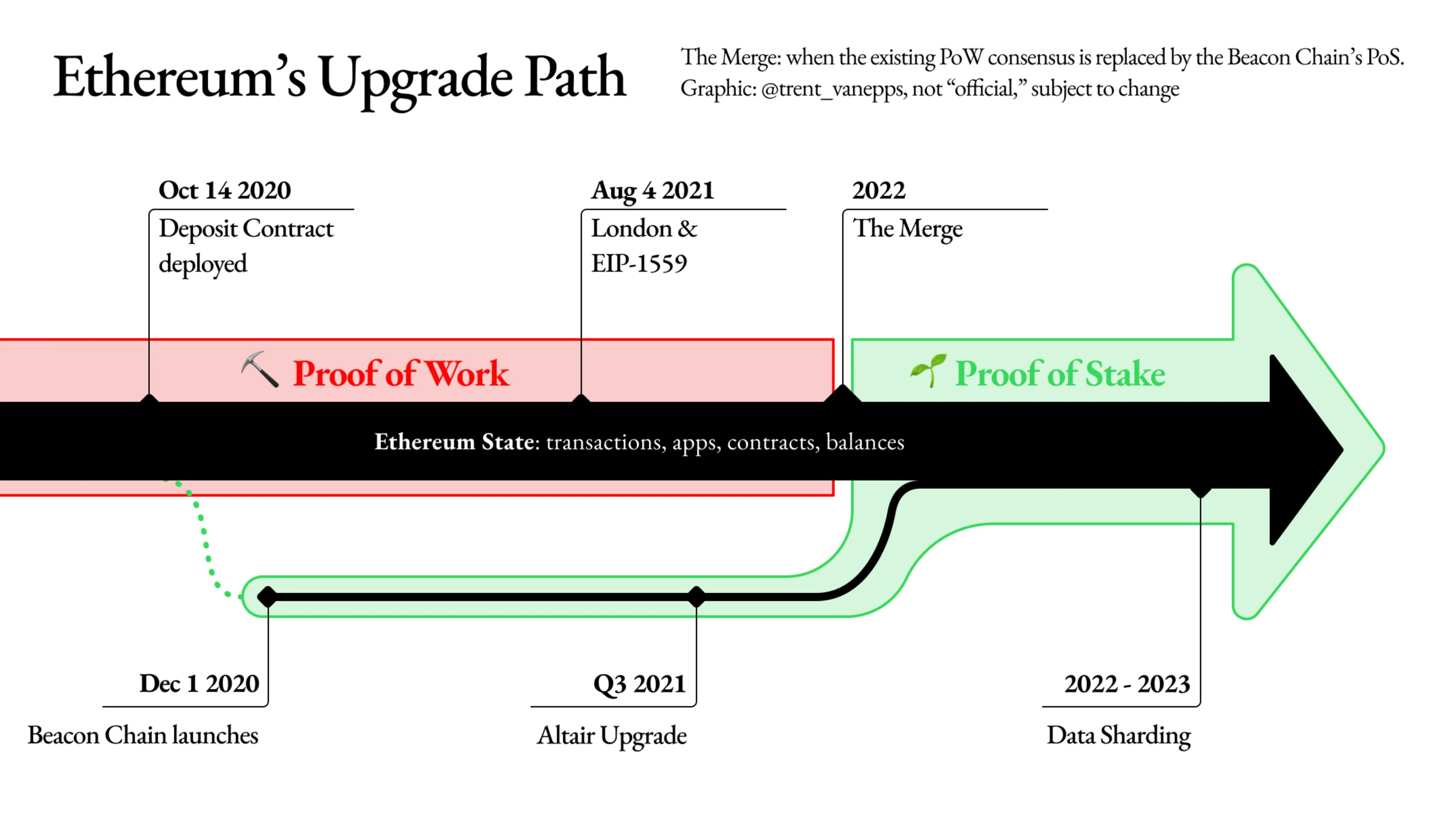 首先,根据以太坊升级路线图,信标链(Beacon Chain)与当下Eeh1合并最终会在2022年年中到来,同时启动难度炸弹,PoW矿工将被淘汰出局,以太坊共识机制转PoS。