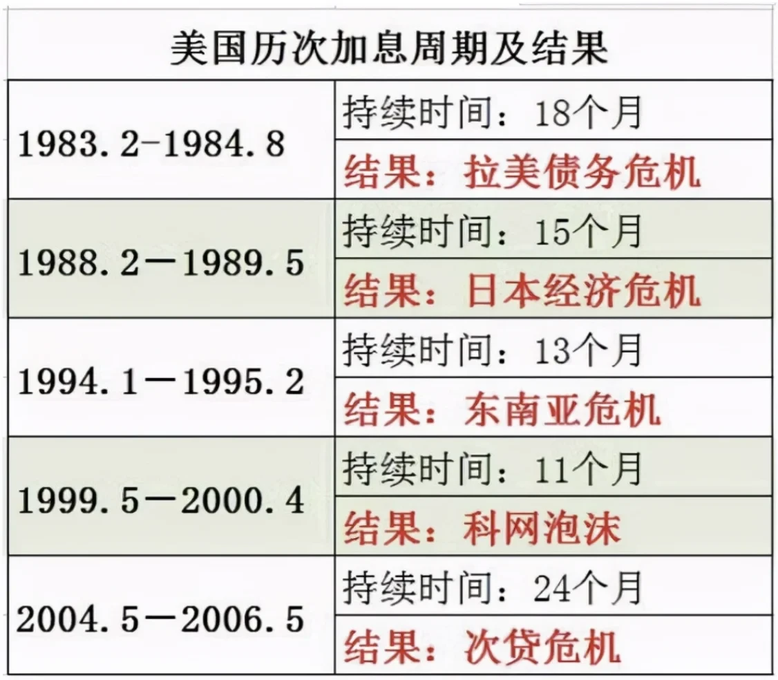 在美联储刚放风出来要加息的时候,就已经有网友总结了美联储最近5次加息周期所带来的影响(如下图),可以看出每一次美联储加息都会在全球范围内引起灾难性后果,一些地区或者行业甚至会面临灭顶之灾。