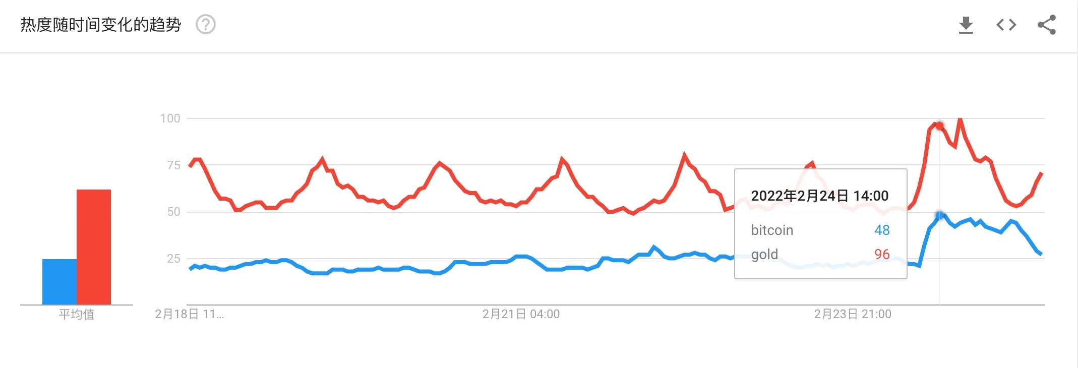其次,相对于黄金这样的传统避险资产而言,比特币仍然是一种风险相对较高的资产,因此在避险属性上不及黄金,在面临巨大恐慌时,对大多数人来说不会作为主要的避险选择。这一点在数据上也有所体现。根据GoogleTrends最新数据显示,“Bitcoin”和“Gold”的全球搜索热度从2月24日10点左右出现快速增长趋势。“Bitcoin”的搜索热度最高达48,“Gold”的搜索热度为96。