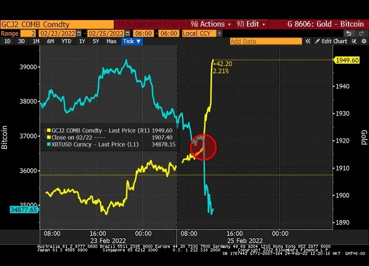近日,受俄乌冲突升级影响,全球多国股市跳水,加密市场难逃大跌。比特币价格自2月16日以来一路下跌,于24日失守35000美元关口。与此同时,黄金价格一路上涨。伴随着近期行情走势变化,被称作“数字黄金”的比特币,其表现似乎与避险资产渐行渐远。那么,如何看待比特币的避险属性?目前在多方因素的催化下,加密市场将如何变化?