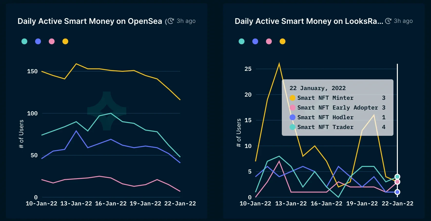 而从“聪明的钱”(Smart Money)的持有者和动向来看,LooksRare也明显无法短时间超过OpenSea平台。目前聪明钱NFT市场活动主要集中在OpenSea平台上,基本在80-90%以上。OpenSea上的NFT巨鲸用户活动量在整个市场占比也在90%以上。从每日活跃的“聪明钱”用户数量来看,LooksRare的铸造用户大幅减少,OpenSea的日活用户数量虽也有下降趋势,但趋势较平缓,其持有者和交易者仍然大约是LooksRare的15倍以上。