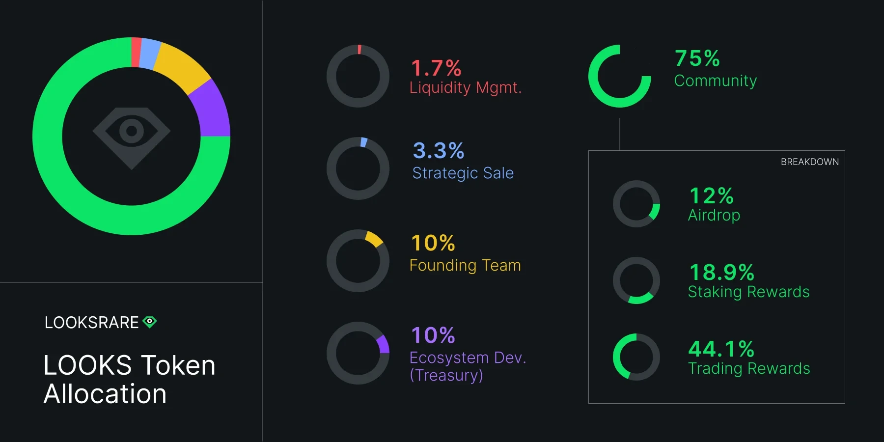 LOOKS是LooksRare平台的治理通证,总量的四分之三归社区所有,其中63%用于激励代币质押者以及平台交易者,剩余12%是回溯性空投奖励,代币分配方式体现了该平台以社区为中心的特点。据官网介绍,LooksRare是一个由匿名团队基于以太坊新推出的社区主导型的NFT交易市场,2022年1月10月,宣布正式上线代币LOOKS,并对OpenSea用户进行空投,只要在2021年6月16日至2021年12月16日期间,在OpenSea交易3ETH及以上,并在LooksRare挂单一枚NFT的用户,无需成交即可获得LOOKS代币空投。