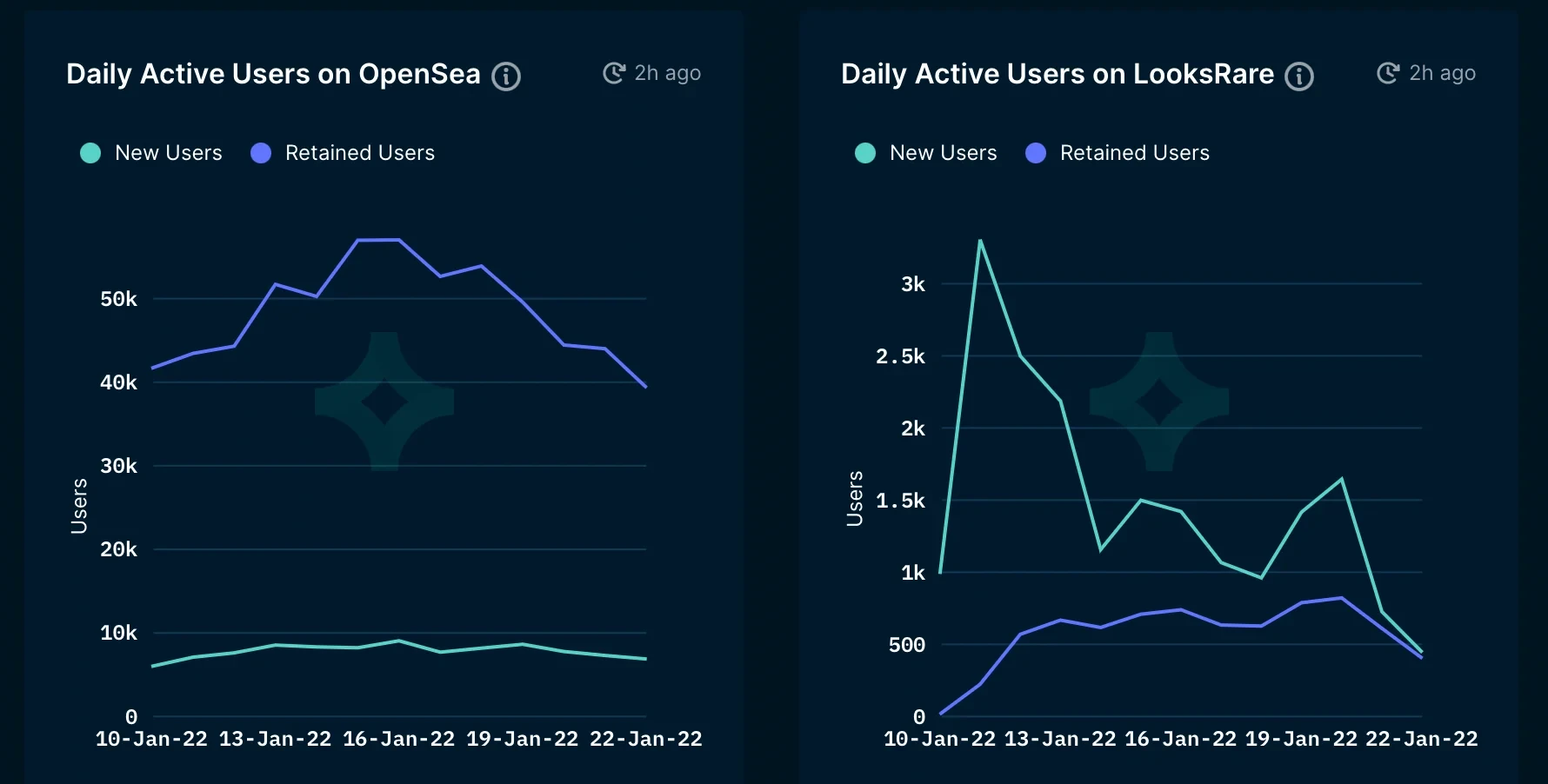 目前,LooksRare的表现不够稳定,在活跃用户和交易量方面与OpenSea仍有相当差距。最新数据显示,LooksRare近24H用户数量为737,较前一日下降了32%,新用户减少趋势非常明显;OpenSea的用户数量为4.42万,活跃用户的构成主要是留存用户,日活用户较前一日减少了8.59%。