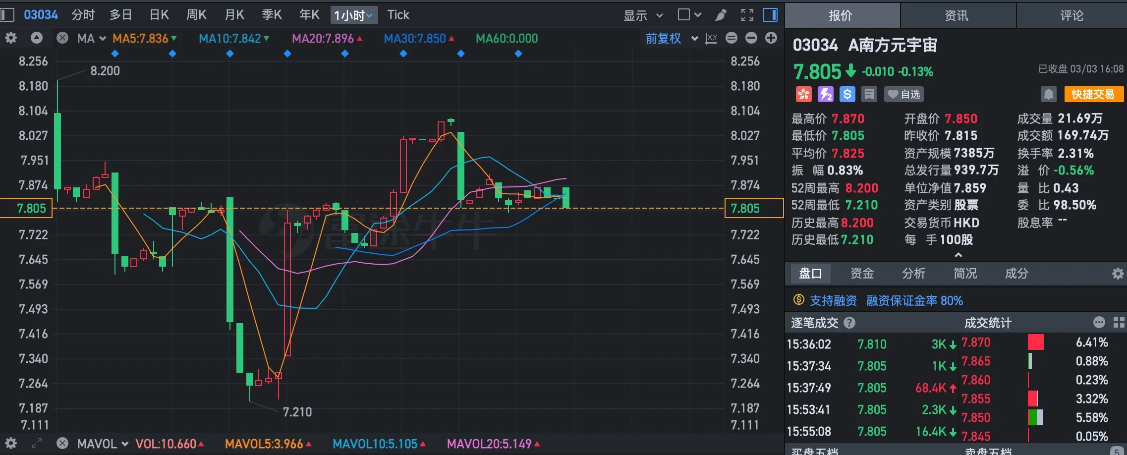 反观中国市场,在今年以前,国内尚无以元宇宙直接命名的基金产品。随着元宇宙热度的持续,香港首只元宇宙主题ETF——南方东英元宇宙概念ETF(A南方元宇宙)于今年2月21日在港交所推出上市,起始价格约为7.8 港元/股,每手交易为100股,管理费为0.99%。根据行情显示,该ETF上市首日最高涨至8.2港元,截至3月3日收盘暂报7.805港元。