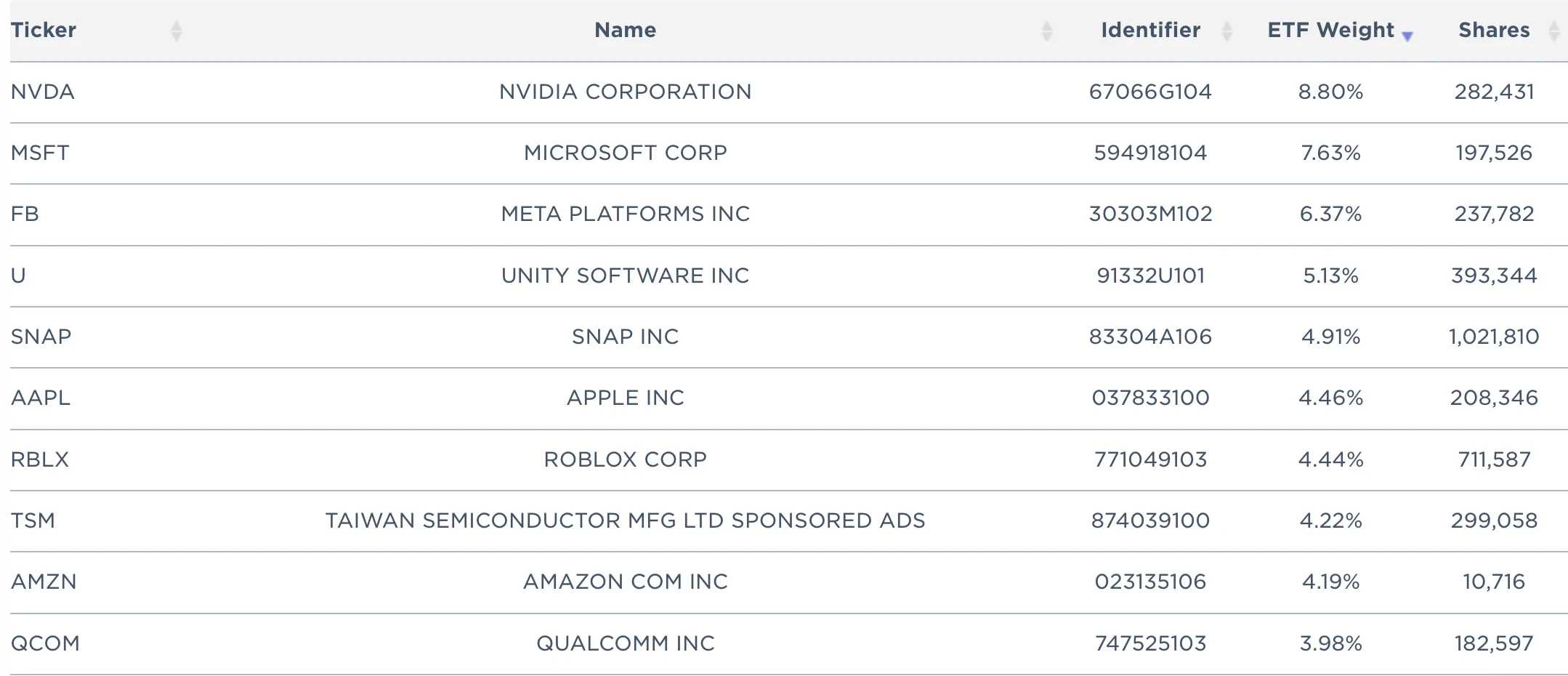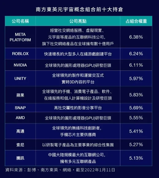 作为香港市场首只元宇宙ETF,南方东英元宇宙概念ETF由南方东英资产管理公司推出,采用主动管理策略,主要投资于提供有助于元宇宙发展的产品或服务的公司。从该元宇宙概念ETF投资组合来看,前十大持仓股主要为全球大型科技公司和芯片制造商,包括Meta(原Facebook)、Roblox、英伟达、Unity、苹果等。