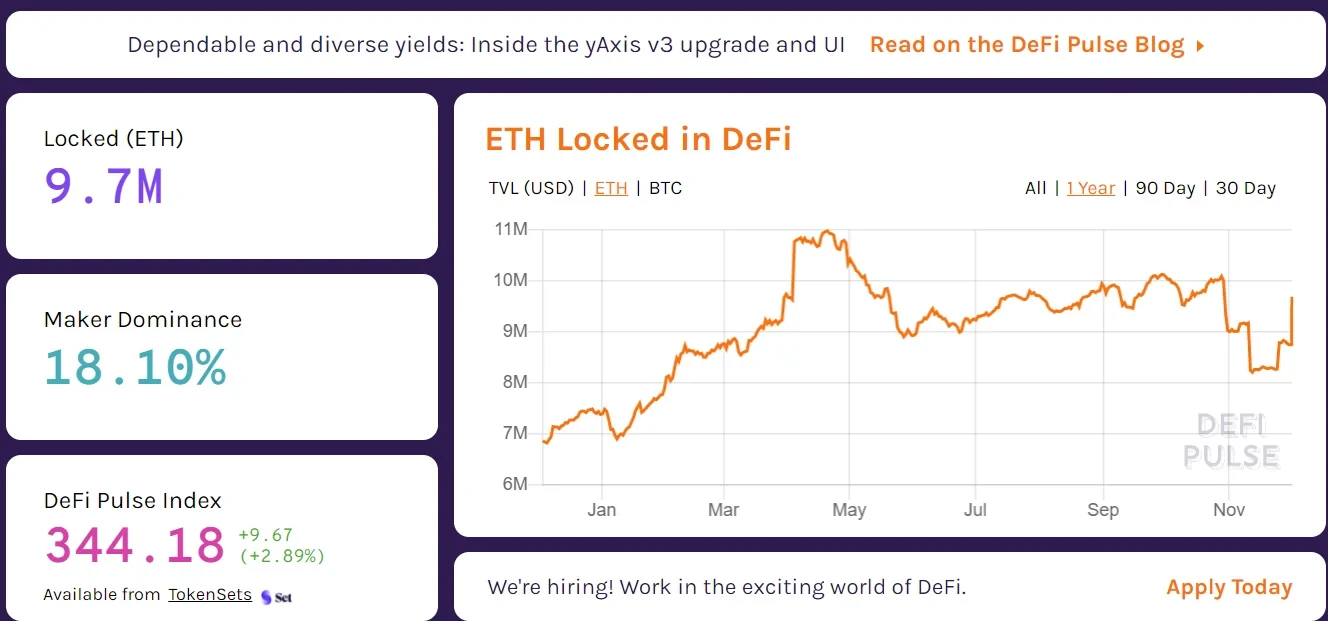 据defipulse的统计信息,截至2021年12月1日,在以太坊网络中各DeFi智能合约中锁定的ETH数量是970万枚,略低于今年第二季度的峰值1100万枚。
