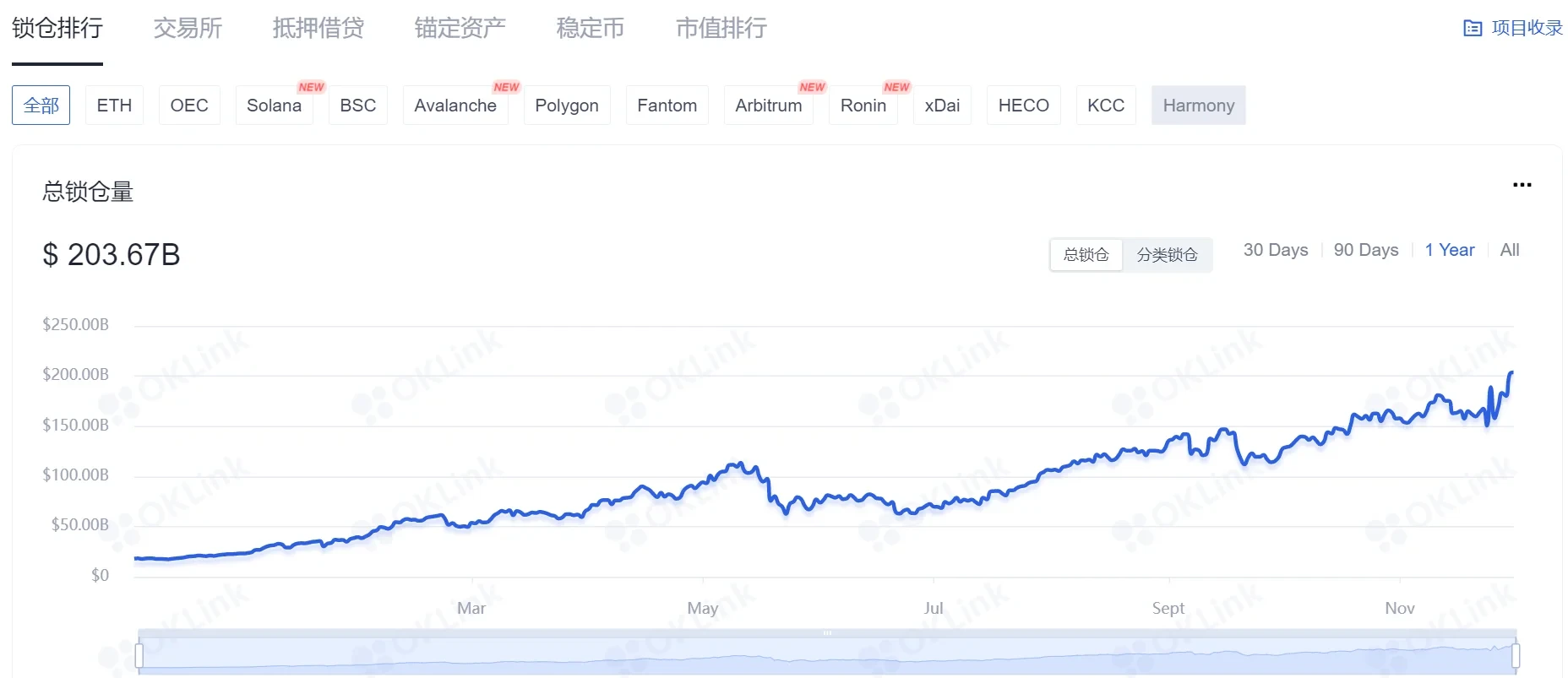 据欧科云链链上大师的数据,截至2021年11月30日,全网DeFi 智能合约中总锁仓资产价值已经达到了2036.7亿美元,再创历史新高。