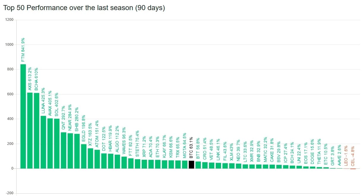 按照blockchaincenter对山寨季指数的定义,如果市值前50代币中75%的币种在连续90天价格表现优于比特币,那么此时的加密市场就处于山寨季。