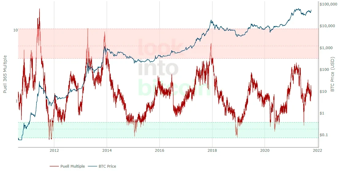 The Puell Multiple显示了比特币每日发行价值变化情况,当该指标处于历史极低位置时,Puell Multiple将进入绿框区域,在这里购买比特币将为投资者带来了巨额回报。相反,当该指标处于历时极高位置时,Puell Multiple进入红框区域,因为在这里出售比特币将会使投资者获利了结。