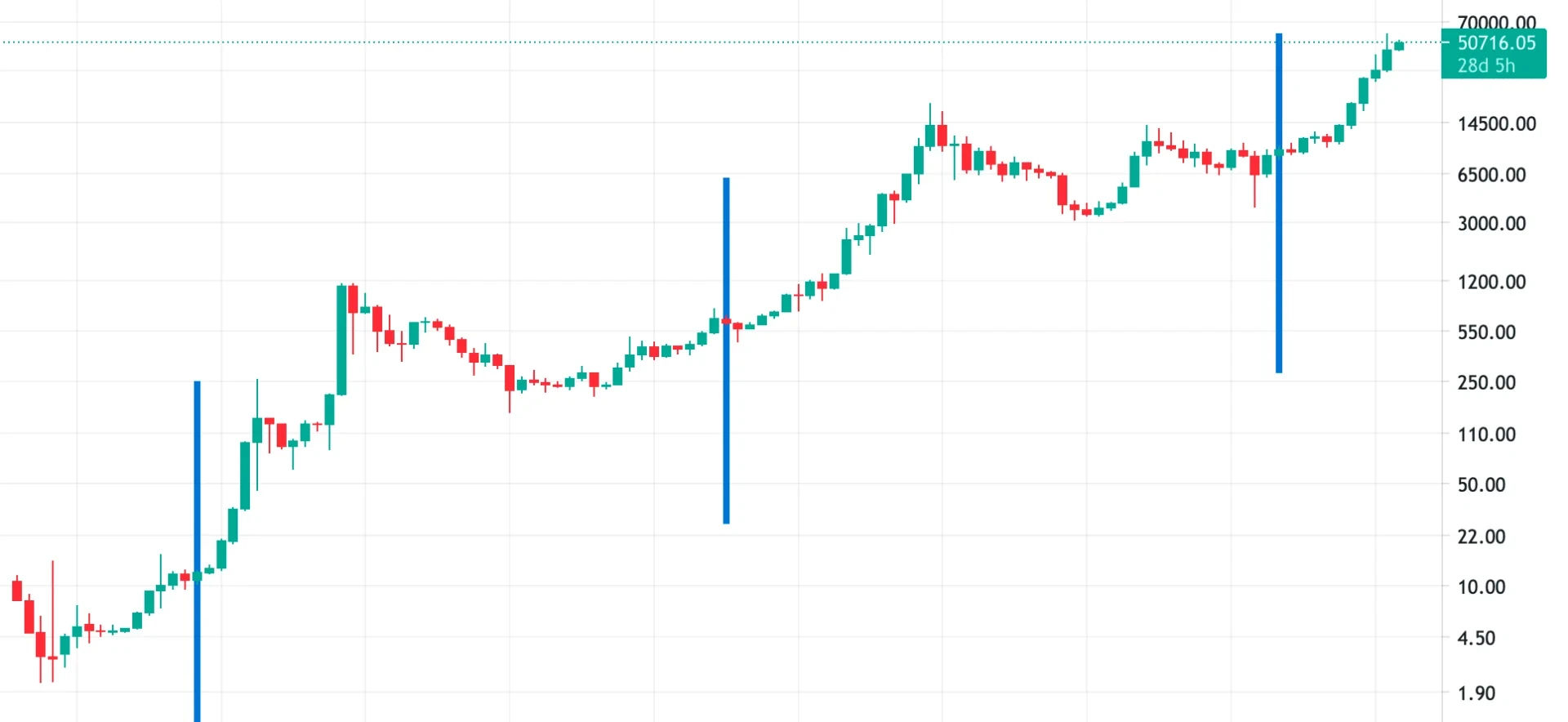 比特币减产与比特币价格关系是怎样的?通常情况下,供应量减少通常会导致价格上涨。在下图中,垂直蓝线表示前三次减半(2012-11-28、2016-7-9 和 2020-5-11)。