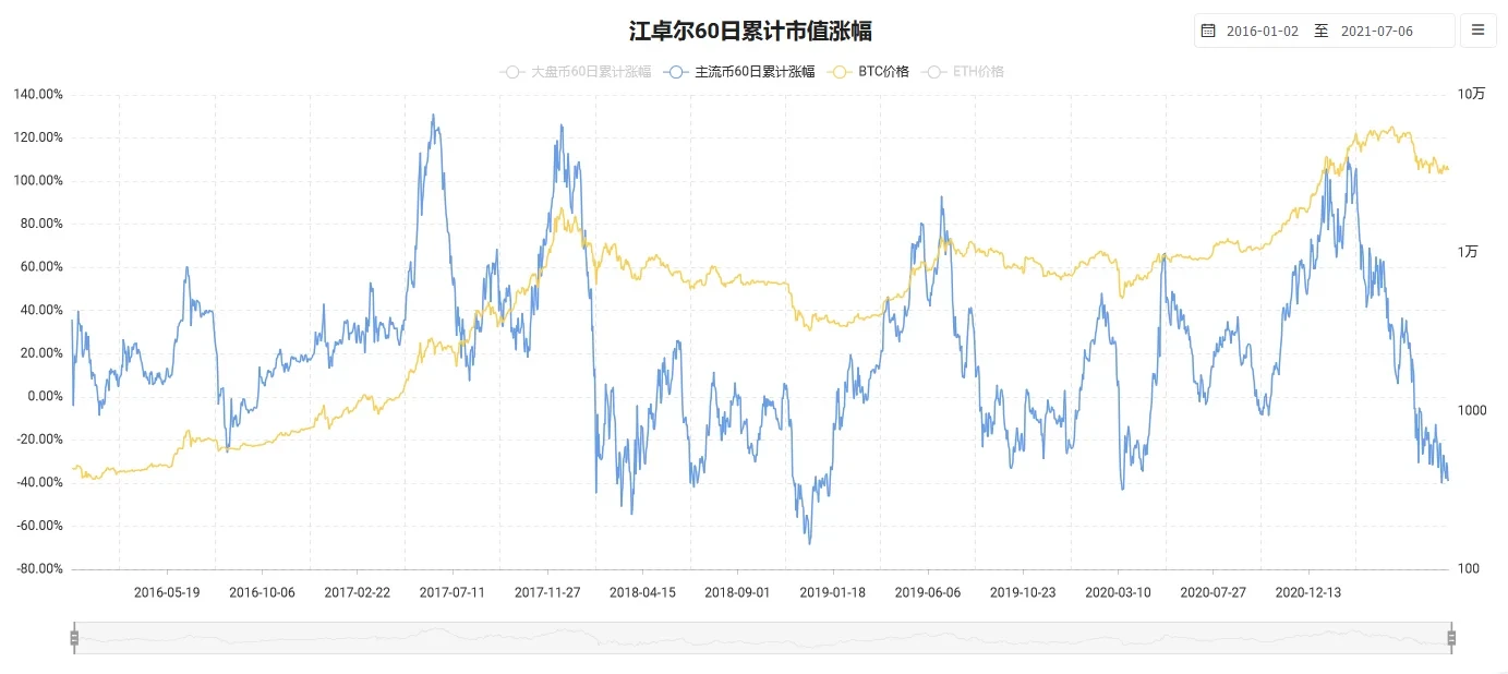 该指标由莱比特矿池CEO江卓尔创建,指标创建者认为,牛市后期市场进入情绪狂热阶段,整个加密市场泡沫严重,将会导致大盘币及主流币涨幅超过新人新资金入场速度,此时将会进入牛市泡沫破裂时期,熊市将会随之而来,即“60日累计涨幅”过高。