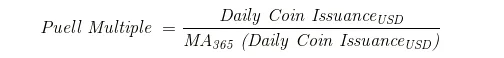 另一个在功能上与RHODL Ratio类似的指标也值得关注,即The Puell Multiple,该指标由推特博主David Puell于2019年3月创立。