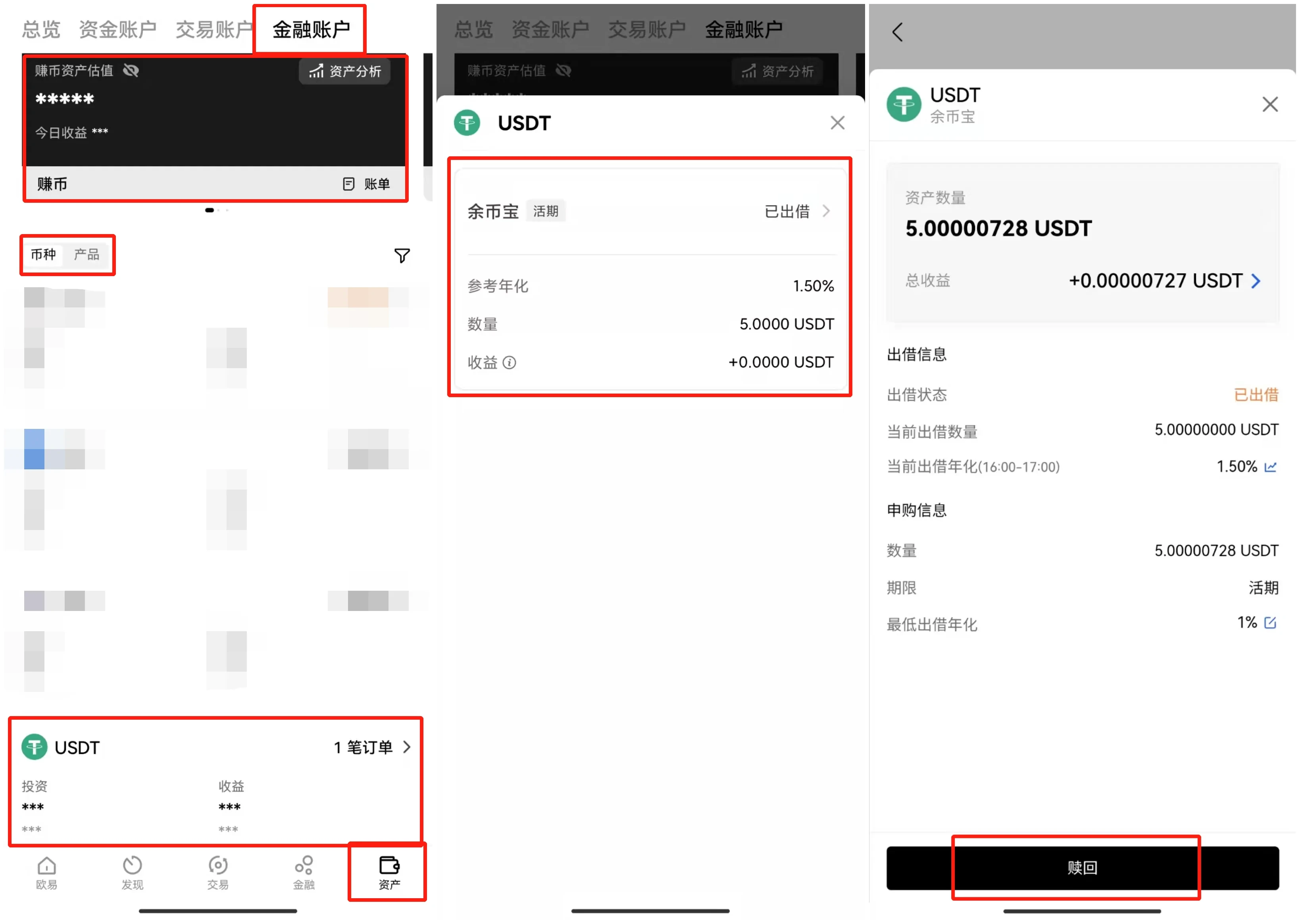 申购后的金融业务产品,无论是否成功出借,都可以打开欧易【资产】页点击【金融账户】—【选择申购的币种】—【订单管理】—【赎回】即可完成赎回操作。