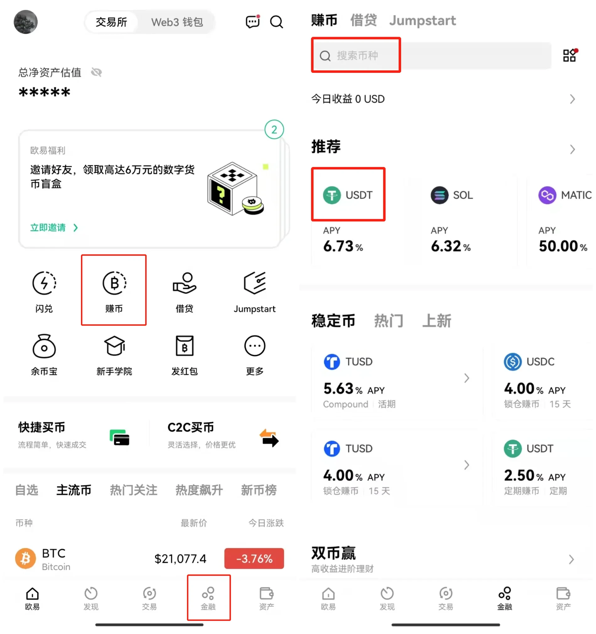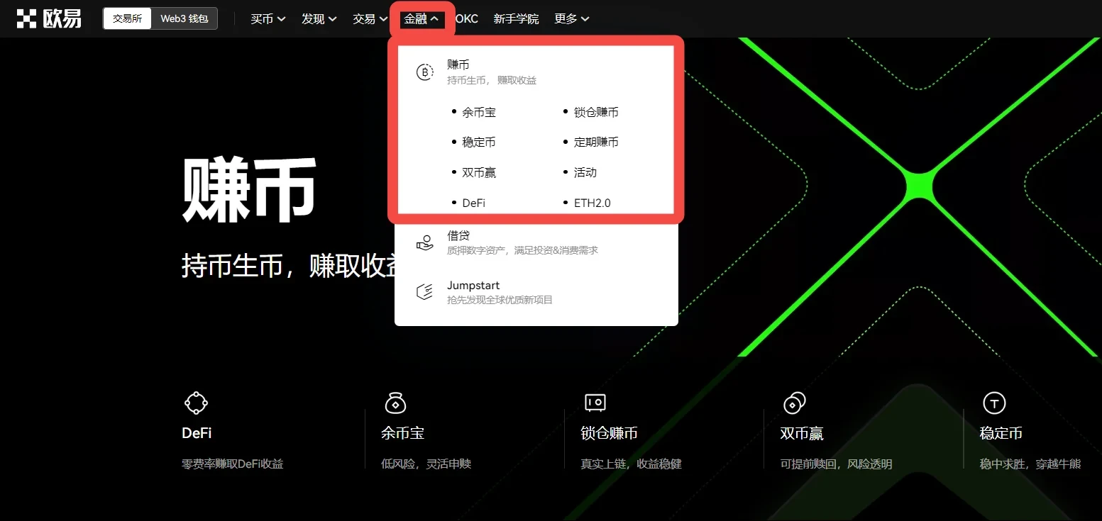 目前,欧易已经开启“赚币”(EARN)等金融服务,为用户提供锁仓赚币和余币宝等多种服务,以便用户可以自由选择产品,通过简单三步操作,利用闲置的数字资产来获得稳定收益。