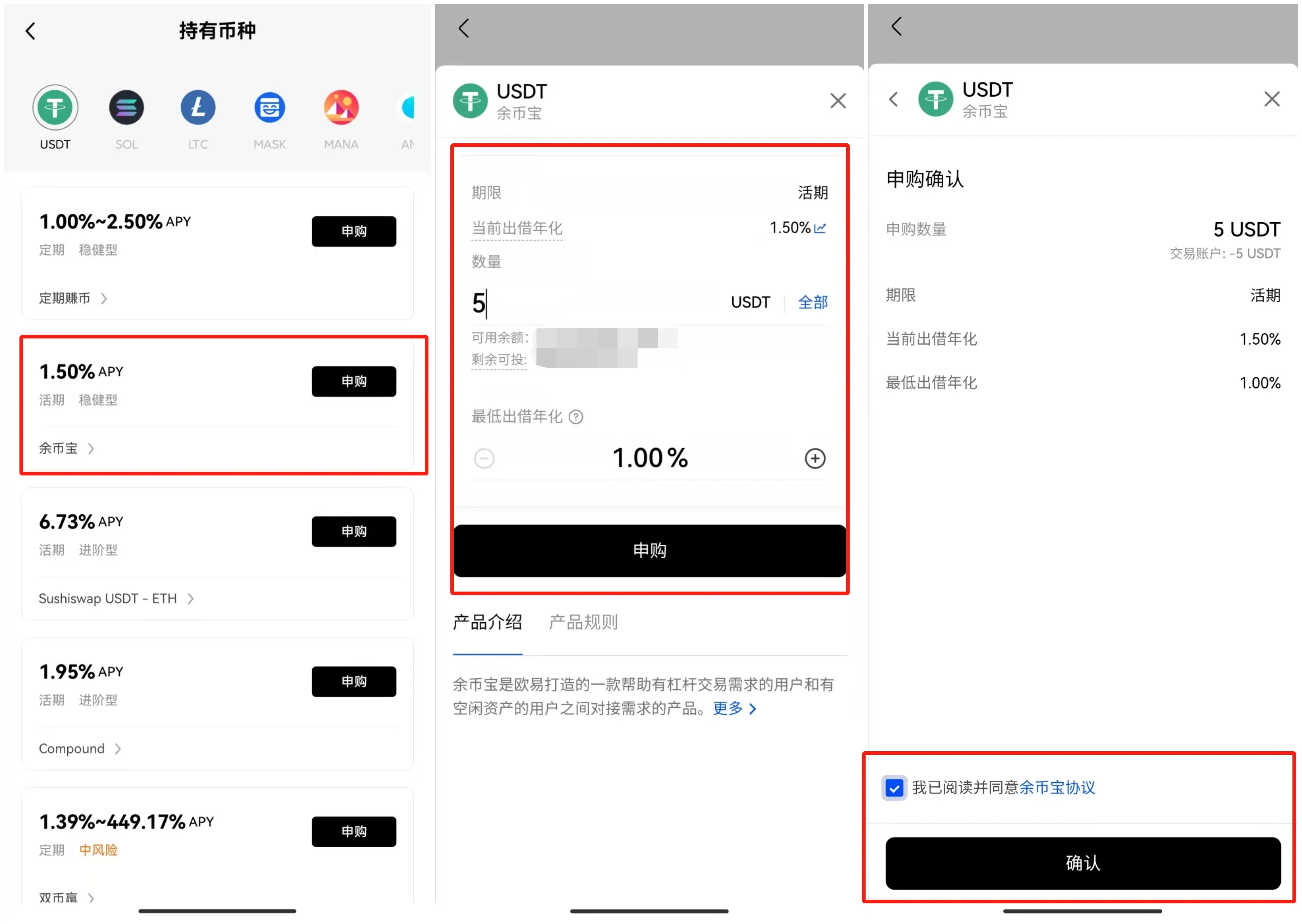 1.余币宝申购币种还包括BTC、ETH、LON等支持币币杠杆的币种,用户可以选择相关币种进行申购。