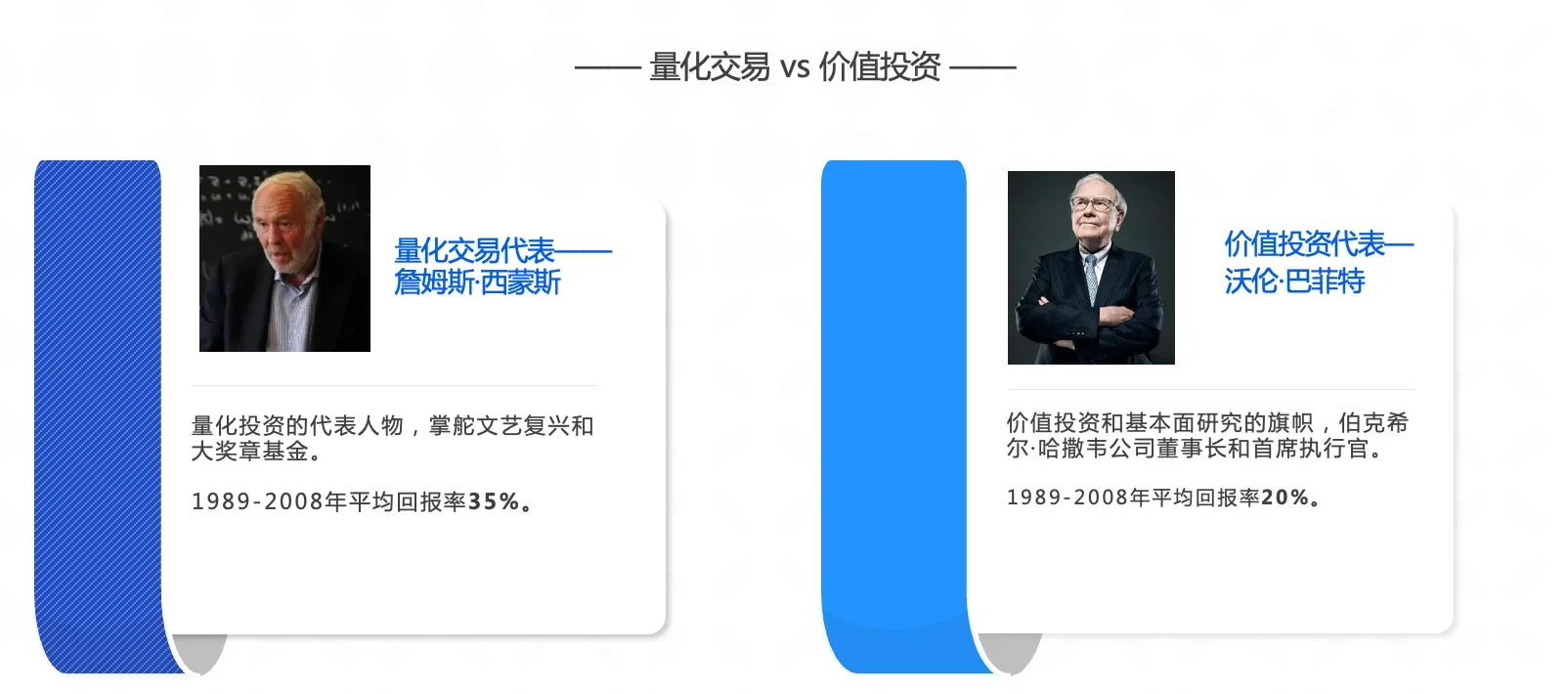 量化策略交易在国内的时间较短,实际上已经存在很长时间,海外已有30多年的历史,并且由于量化模型的纪律性和系统性,收益更稳定,市场份额不断扩大。有统计称,全球超70%的资金在使用量化策略交易,国内市场预估也有20%的资金使用量化策略交易。全球顶级投行几乎全部是量化策略交易,比如詹姆斯·西蒙斯的文艺复兴,瑞·达里奥的桥水基金。量化策略交易代表——詹姆斯·西蒙斯,1989-2008年平均回报率35%,价值投资代表—沃伦·巴菲特,1989-2008年平均回报率20%,量化策略交易战绩非常惊人。