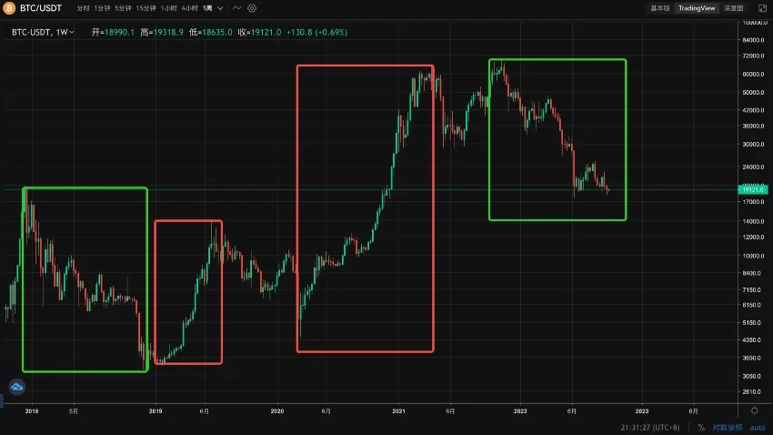 比特币的市值和影响力,在数字资产行业持续雄踞榜首,是行业的风向标,因此我们可以使用比特币的牛熊周期,来定义数字资产行业的风向标。比如在比特币进入熊市的时候,持续定投,在牛市的时候立场,收益就会非常可观。