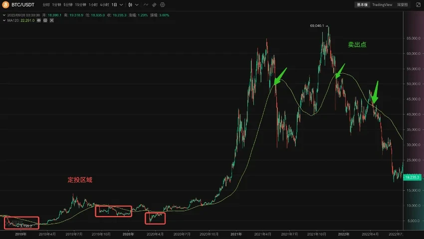 120日均线通常被认为是牛熊转换线,可以在熊市持续定投,在牛市回调跌破120日均线的时候卖出。
