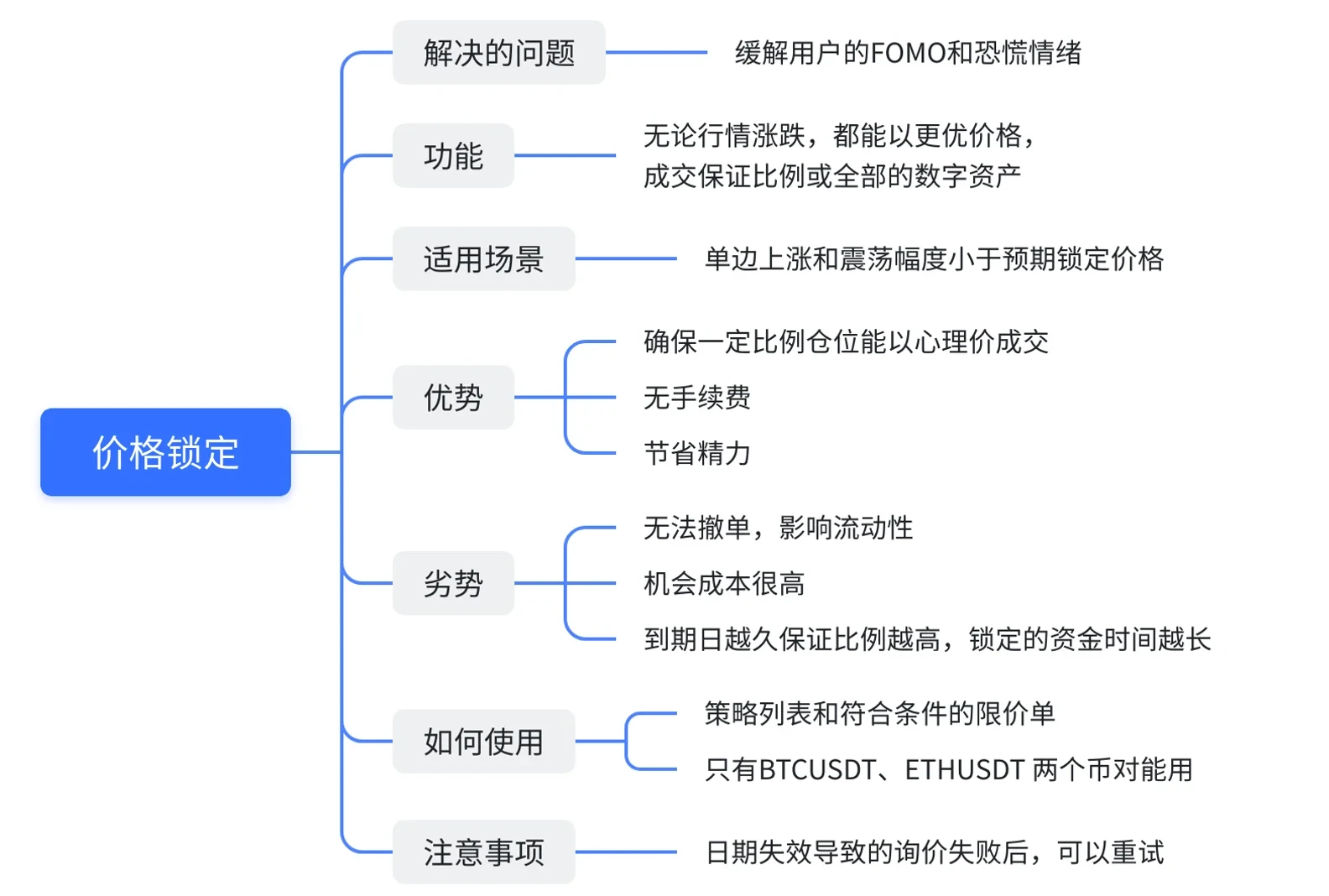 在币币交易中挂限价单的交易者,在遇到挂单价和市价偏差较大的情况下,价格锁定产品可以保障用户按照一定比例,在自定义的到期时间,以挂单价成交一部分资产。