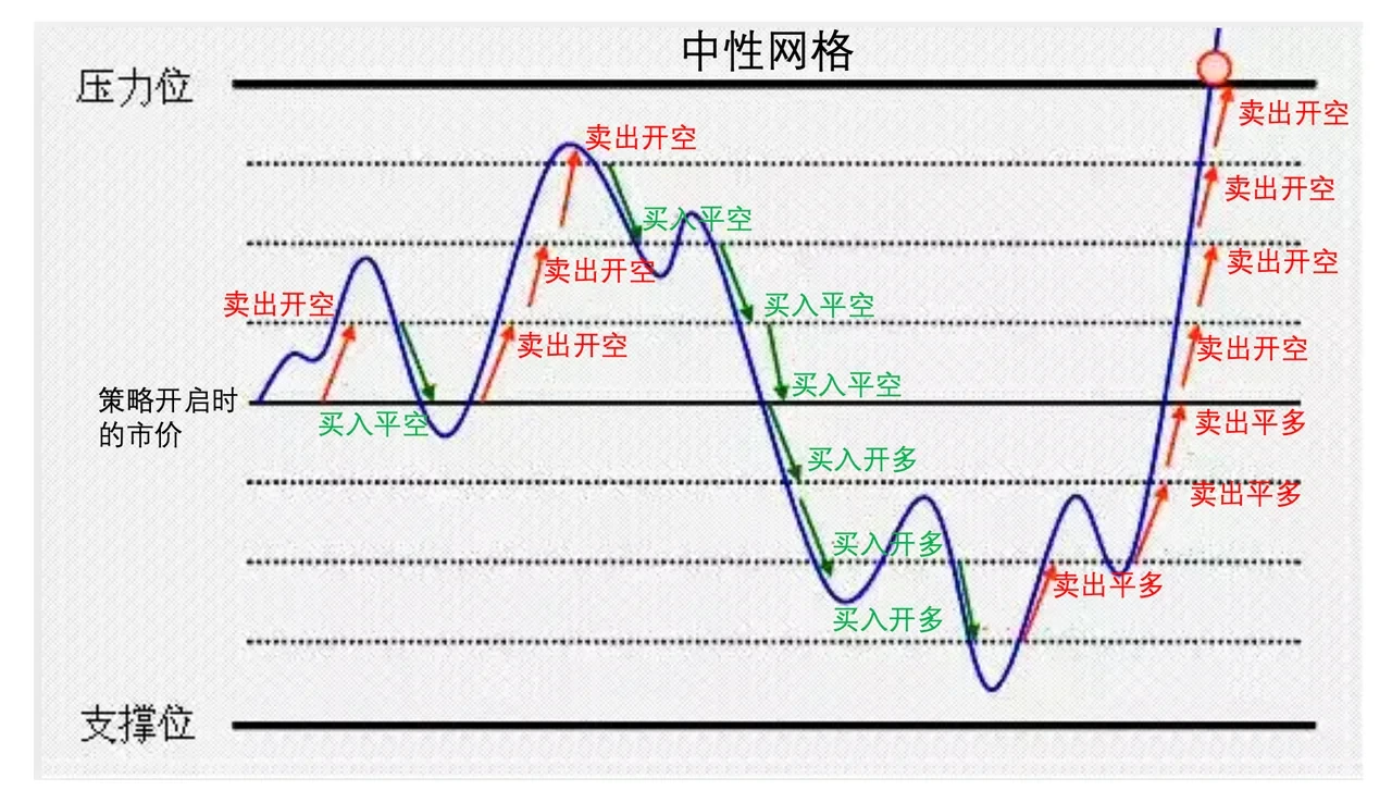 当用户认为,价格会围绕一个中枢,进行上下震荡的时候,可以使用中性网格。中性网格是在策略开启时的市场价格的上方开空/平空,下方开多/平多。