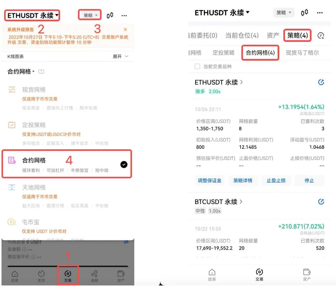 1、在APP端,可在【交易】-【永续合约】-【策略】,在策略列表中,选择【合约网格】,设置好的合约网格,可在【策略】-【合约网格】中查看。