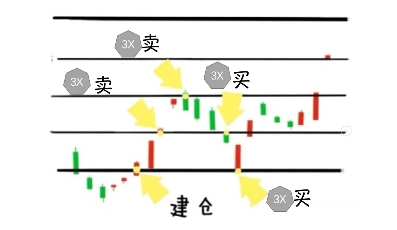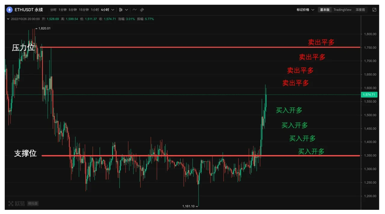 如此随着市场波动而循环地挂单和成交,就可以不断赚取震荡行情中的下跌时的收益。