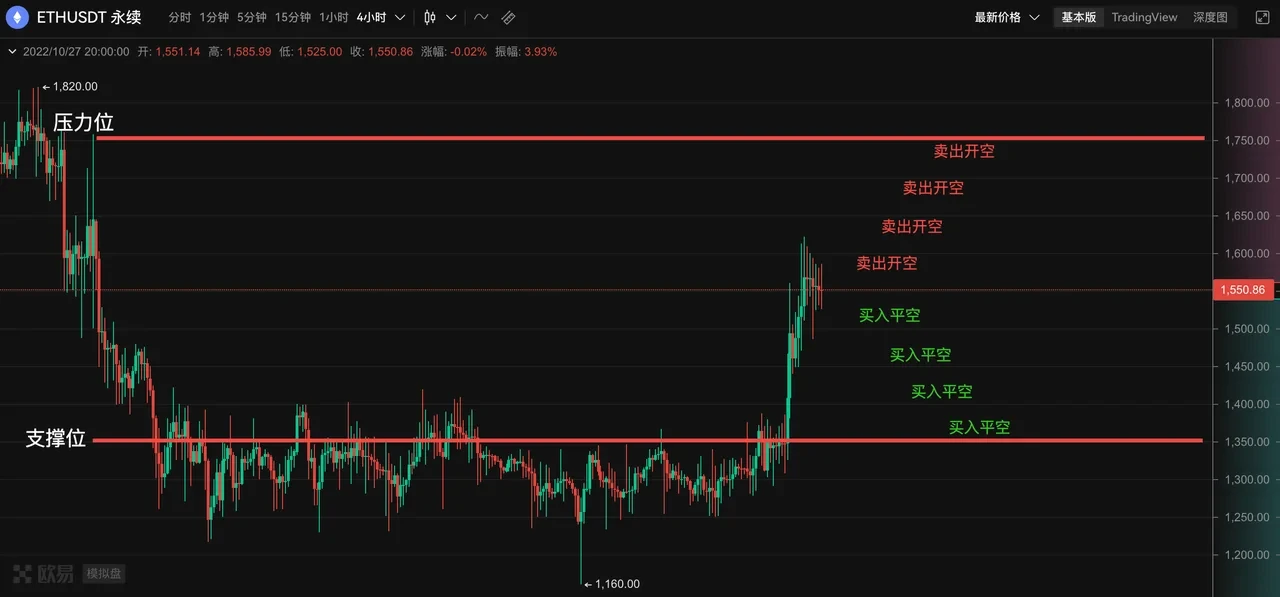 如果价格向上突破1600,则该网格的卖出开空单成交,策略同时在低一档网格1550挂买入平空。