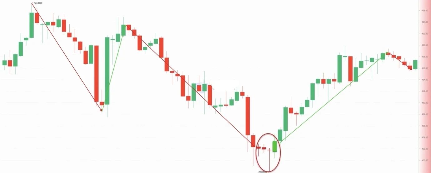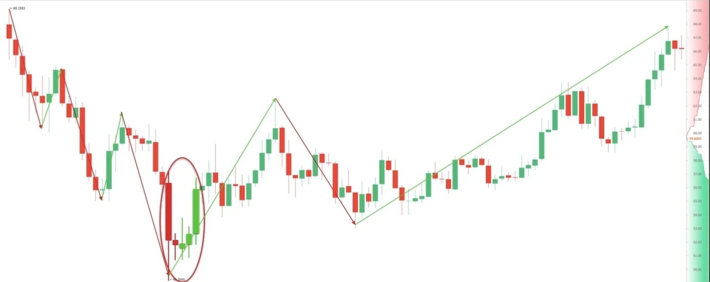 图二,大阳线吞没两根小阴线,形成看涨吞没,随后展开一波上涨走势;