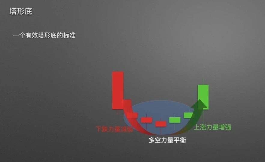 一个有效塔形底要满足:最后一根阳线的收盘价格要超过前面大阴线实体的50%。塔形底展现的是:市场中做空力量逐渐减弱,至多空力量平衡,最后到上涨力度增强的过程。