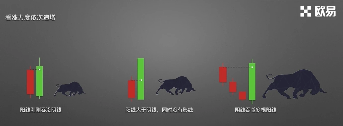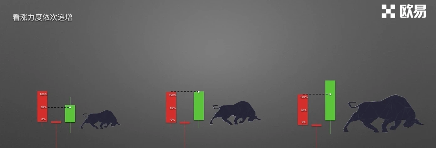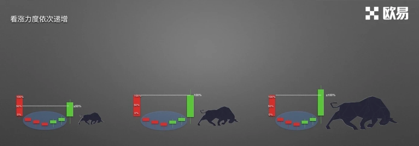 图一,上涨阳线实体刚刚吞前面下跌阴线实体,该组合看涨力度最弱;图二,阳线实体明显高于前面阴线实体,甚至达到前阴线的两倍,该组合看涨力度很强;图三,阳线实体一举吞没前面多根阴线,该组合看涨力度最强。