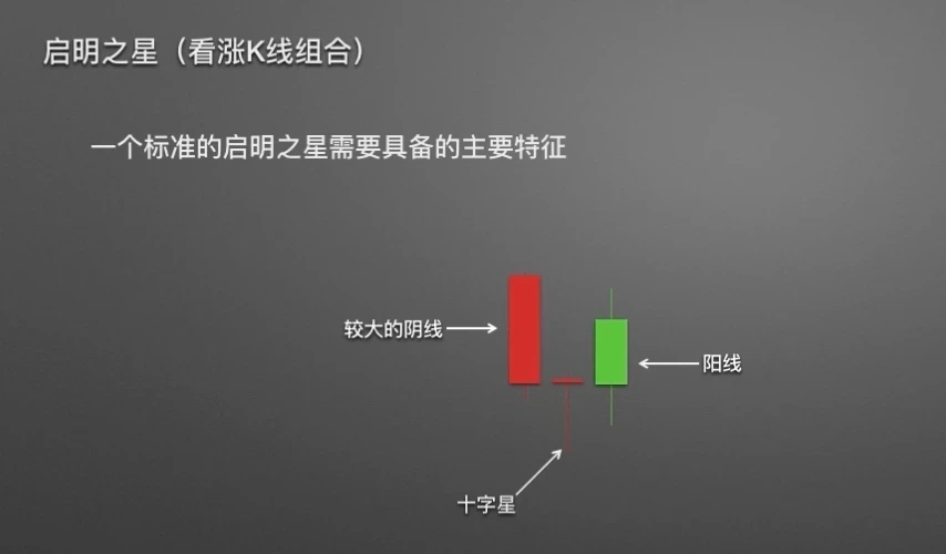 标准的启明之星由三根K线组合而成,首先是一根较大的阴线,随后紧跟一根类似“十字”的星线,第三根K线是一根较大阳线。启明之星是否成立,对第三根阳线的长度有着明确的要求,它的收盘价格一定要高于第一根阴线实体的50%价位。