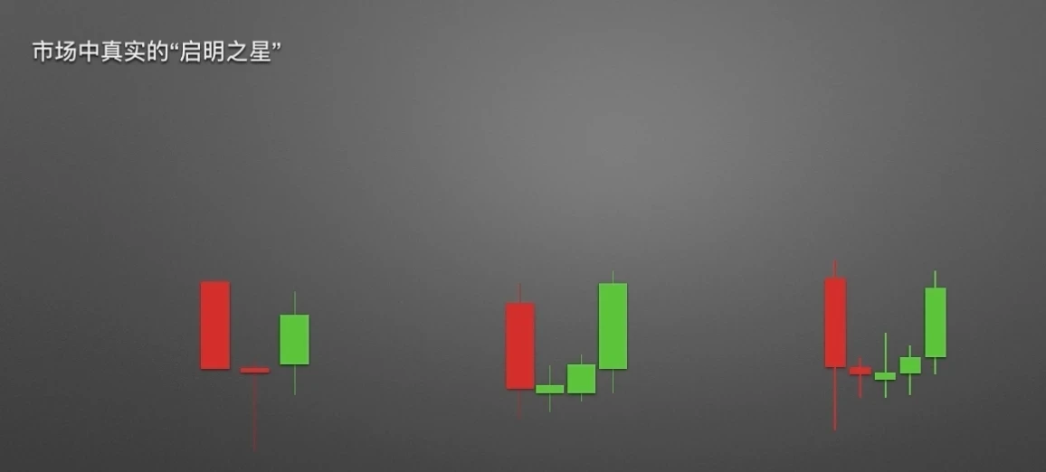 刚刚所讲,是最标准的启明之星组合,但在实际的走势中,启明之星会有一些变化。那么市场中真实的启明之星是怎么样的呢?