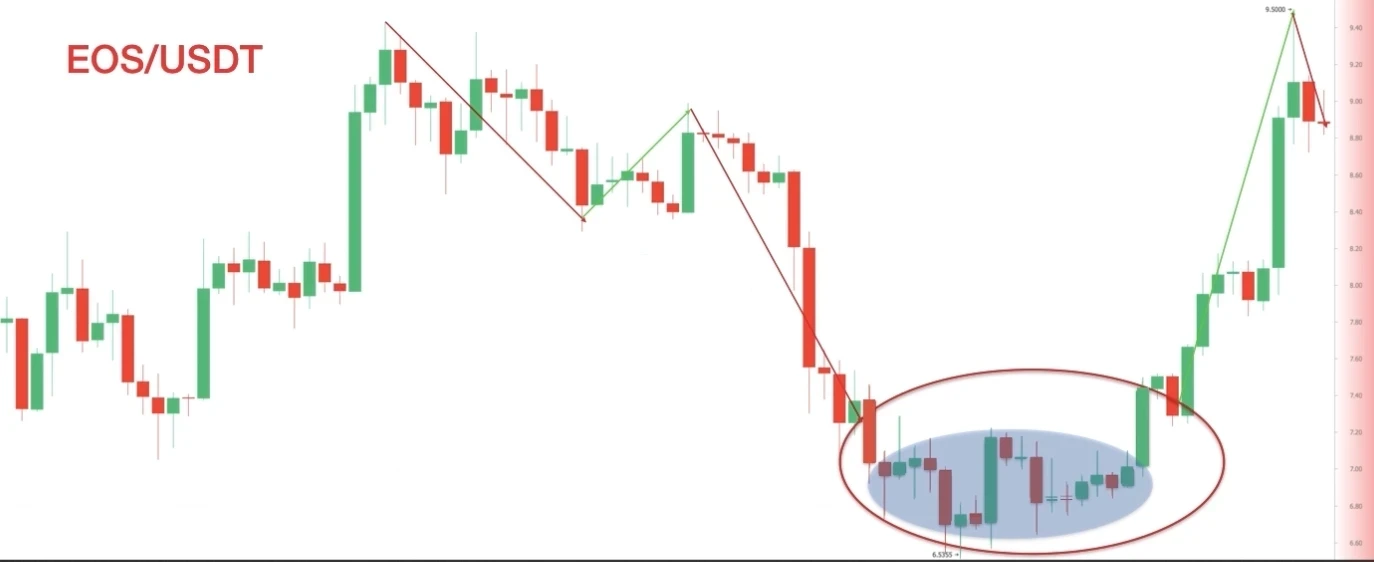变化一,实际样子非常接近塔形底的示意图。截图来自欧易币币交易区EOS/USDT的6小时K线图,塔形底出现在上涨趋势中,再次奠定了上涨优势,随后展开一轮伶俐的上涨行情。