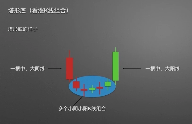 塔形底,左边是一根中阴线或大阴线;中间由若干根小K线组成,通常再5根以上;右边是一根中阳线或大阳线。整体看上去就像一个倒过来的宝塔,因此得名塔形底。