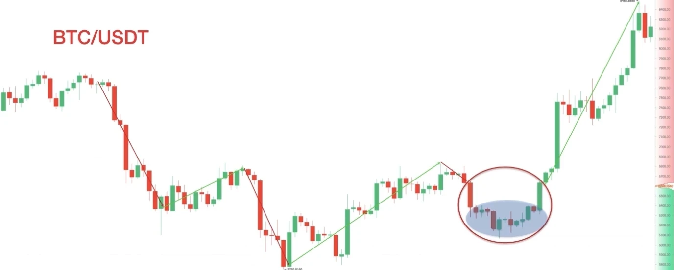 图三,由三根小K线或星线组成。币价大幅下跌,出现启明之星,随后币价止跌反转。