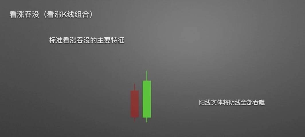 首先,看一下看涨吞没的特征。后一根阳线实体,完全覆盖前面阴线实体,如同阴线被阳线吞噬掉一般,表明多头力量正在大举反攻。因此得名看涨吞没。