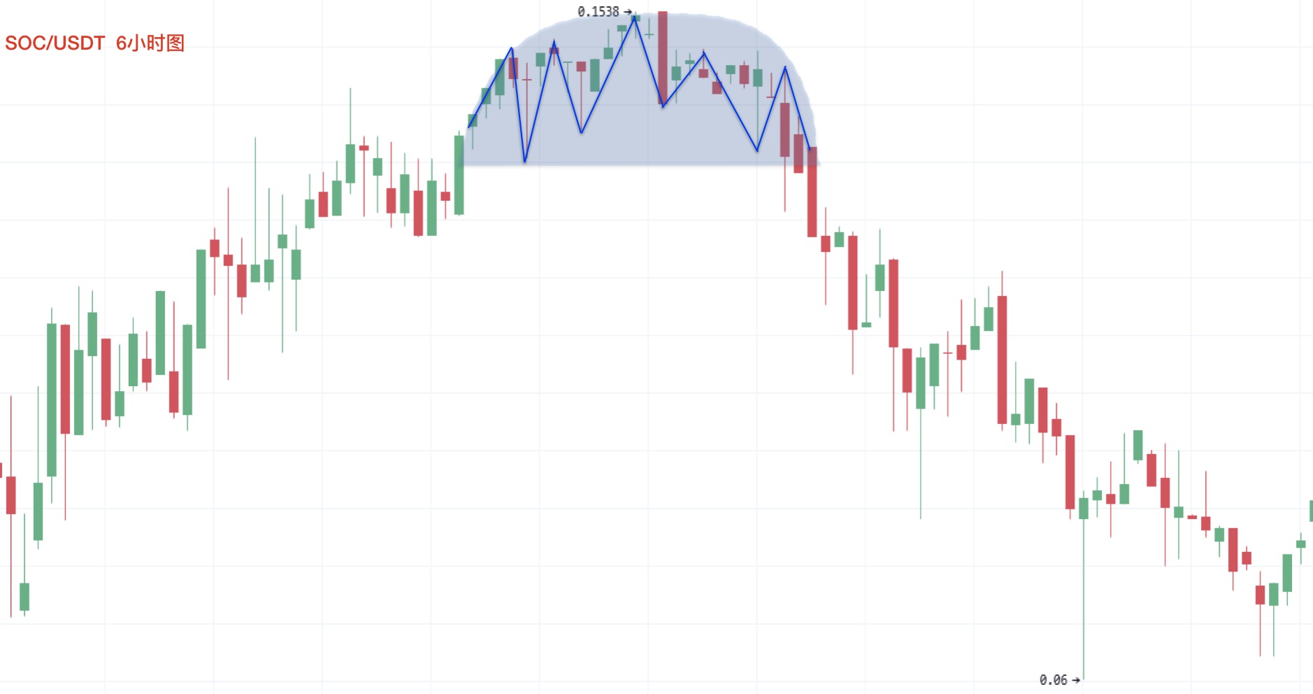 案例一:截图来自欧易 MITH/USDT 6小时图,在经过一段下跌走势后币价形成圆弧顶,时间跨度比较短。在该形态中,只出现了一个卖点,随后币价出现大幅下搓,并快速跌超最小目标位。
