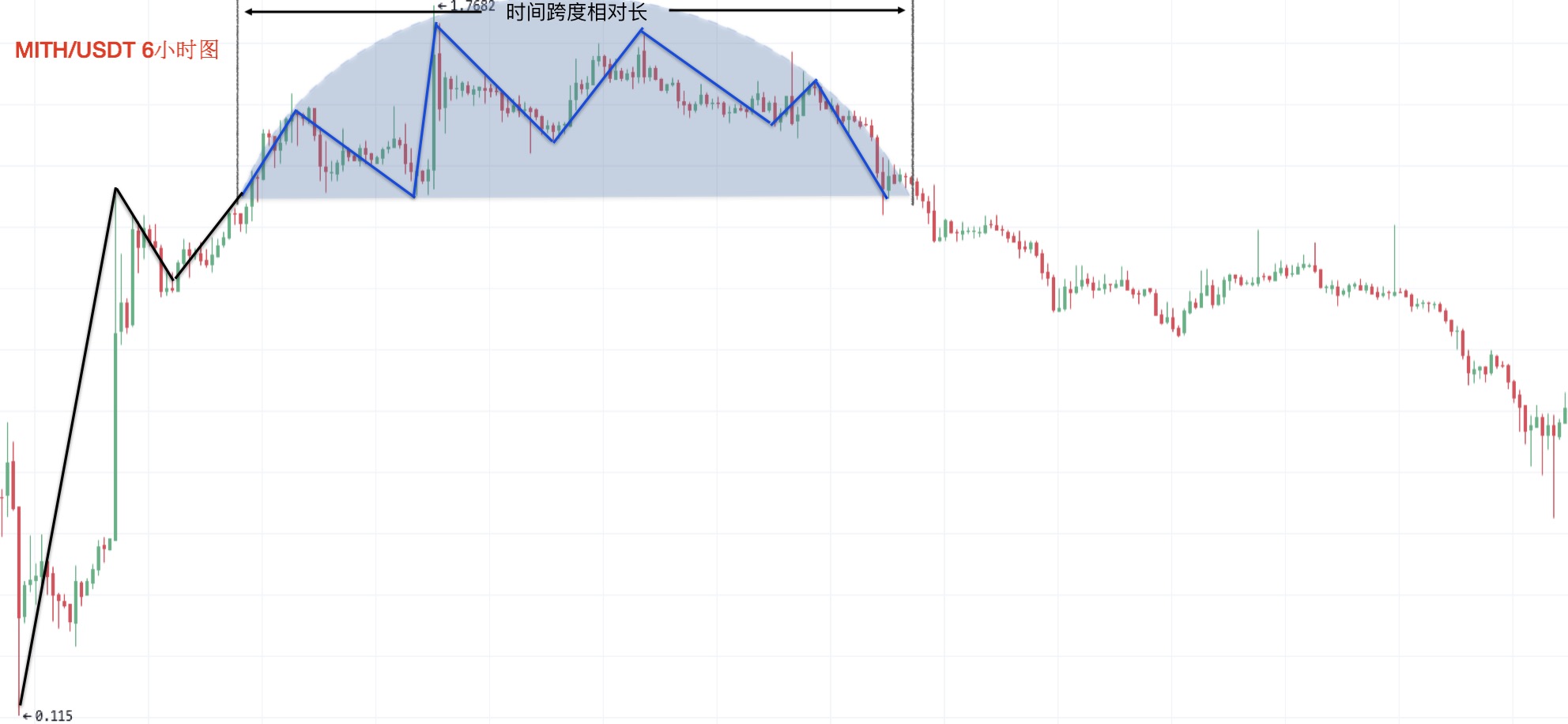 案例二:截图来自欧易 MITH/USDT 6小时图,币价在经过一段快速上涨后形成圆弧顶,并出现比较标准的三类卖点,而后币价持续回落,超越最小目标位。
