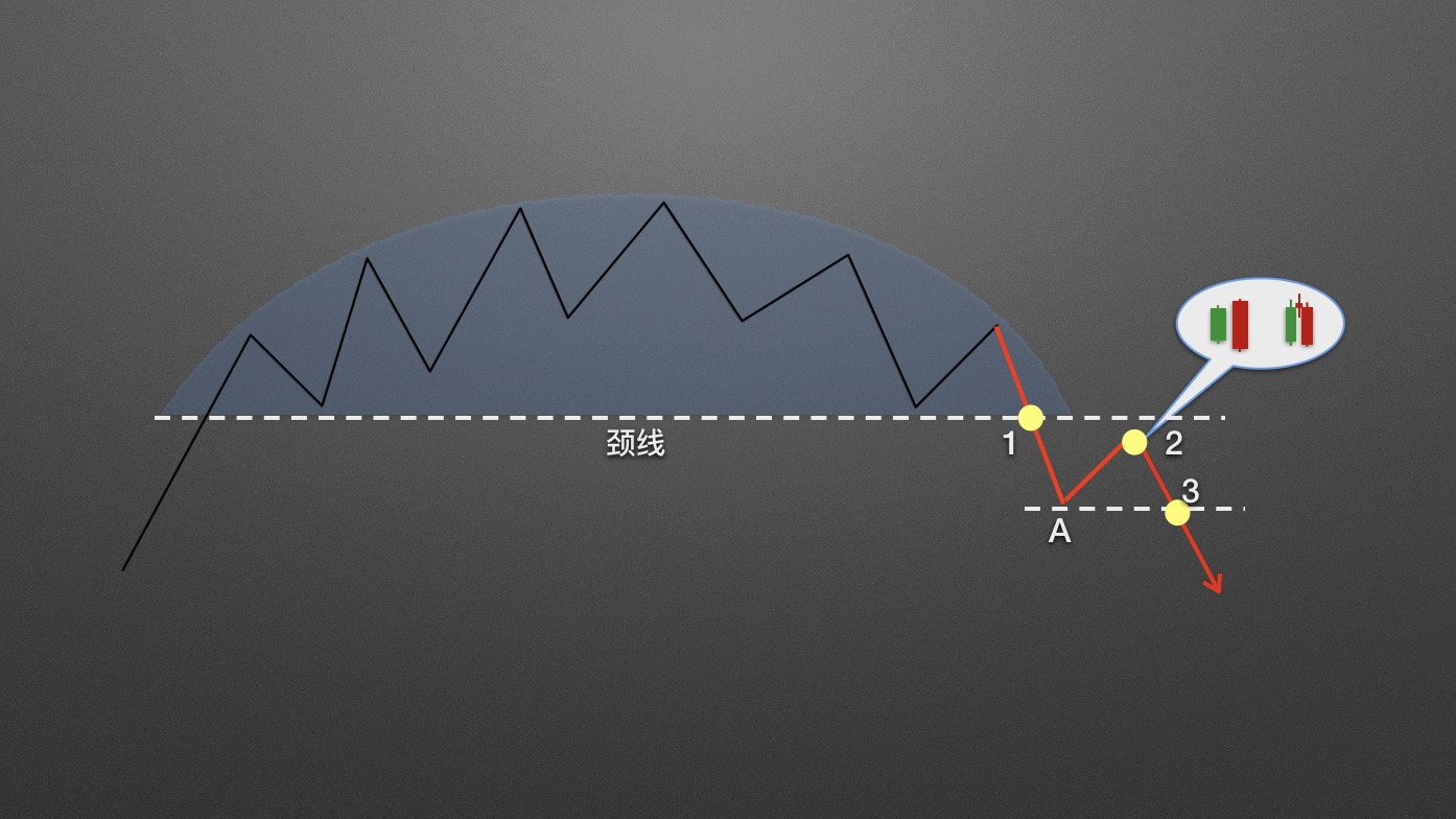 如图所示:当某根K线收盘后,实体压过颈线,才可以认为圆弧顶形态成立。
