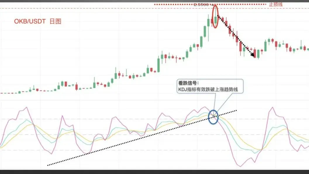 案例一:KDJ指标上升趋势线应用,截图来自欧易 OKB/USDT日线图,币价不断上涨,同时KDJ指标低点不断上移呈明显上升趋势,当KDJ指标有效跌破该上升趋势线,形成看跌信号,同时上方K线出现长上影线,如图中红圈所示,止损线可设在有效跌破KDJ指标上升趋势线对应的上方K线的最高点,随后币价迎来一波下跌。