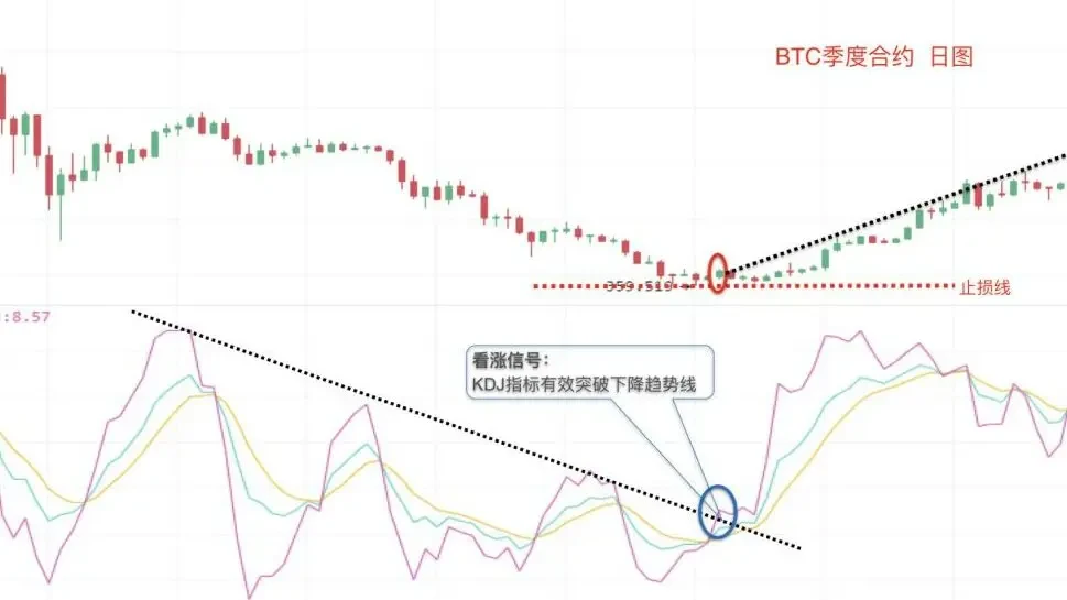 案例二:KDJ指标下降趋势线应用,截图来自欧易 BTC季度合约日线图,币价不断降低,同时KDJ指标高点不断下移呈明显下降趋势,当KDJ指标有效突破该下降趋势线,形成看涨信号,同时对应的上方K线位置如图中红圈所示,止损线可设在有效突破KDJ指标下降趋势线对应的上方K线的最低点,随后币价迎来一波上涨。